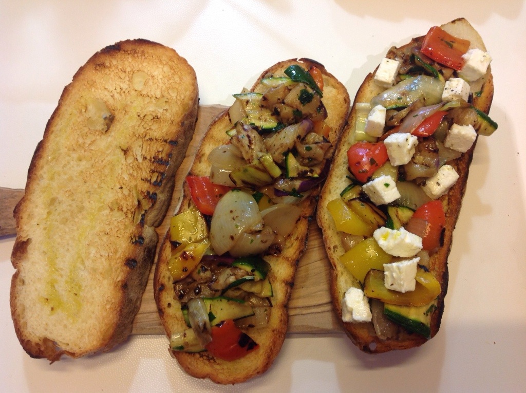 Prendo la fetta di pane tostato, dispongo le verdure griigliate alternando i colori, aggiungo qualche cubetto di Feta e un filo di olio