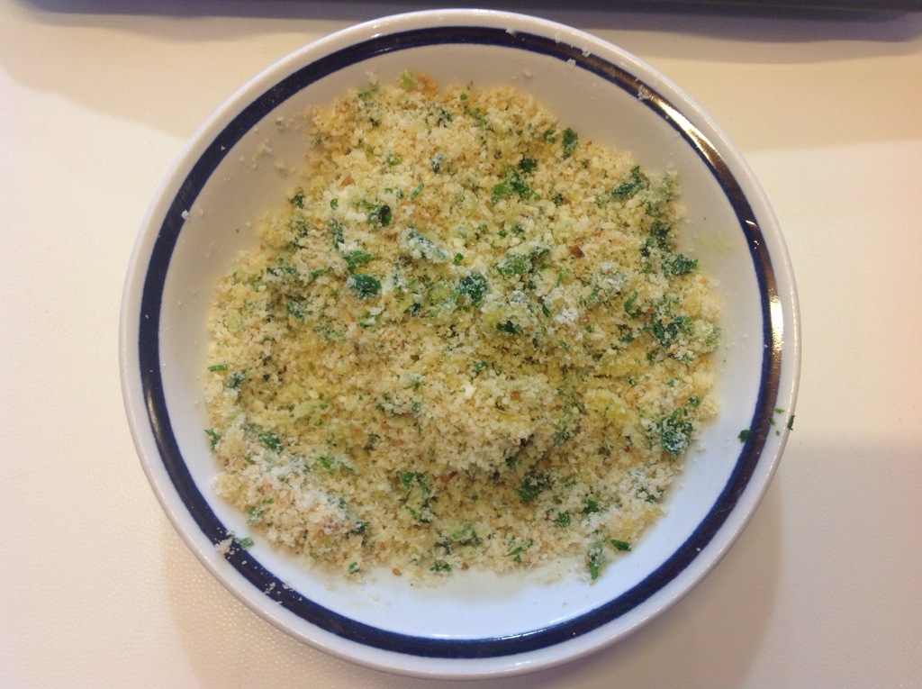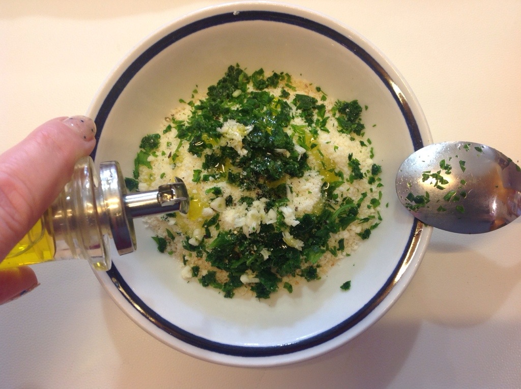 In una ciotolina mescolo il pane grattugiato, il parmigiano, lo spicchi di aglio tritato, sale, pepe e un goccio di olio