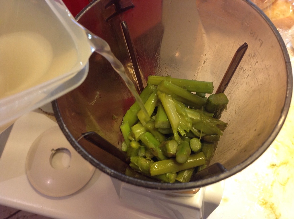 Ho pulito gli asparagi e li ho fatti bollire tenendoli un po’ al dente, ho tagliato le punte e le tengo da parte, ho eliminato il fondo duro e tengo il centro