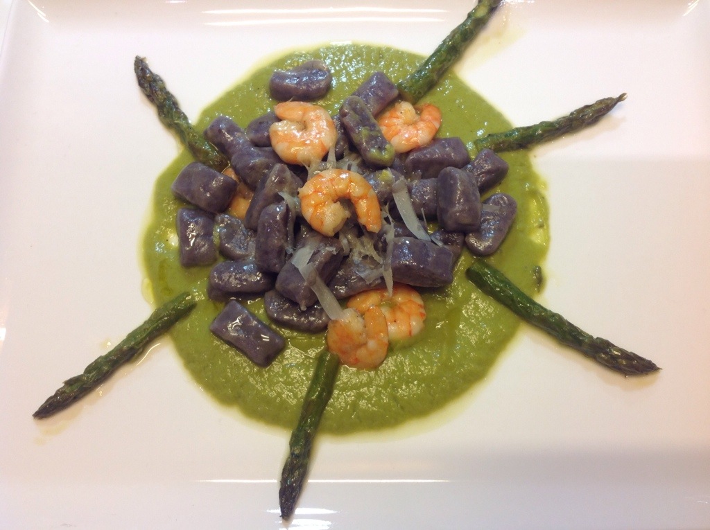 Metto a specchio la salsa calda di asparagi, verso gli gnocchi con i gamberi e a raggiera gli asparagi, finisco con poco parmigiano e un filo di olio