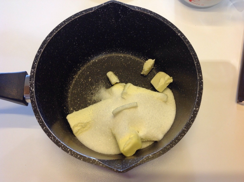 In un pentolino antiaderente verso il burro a pezzetti, lo zucchero