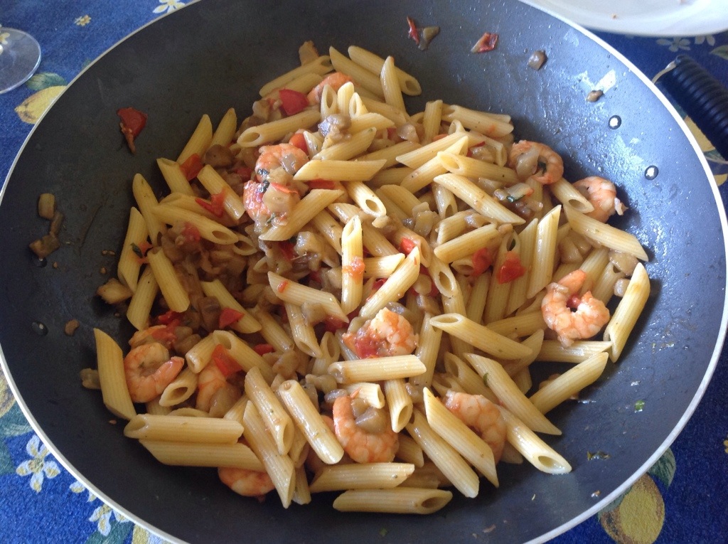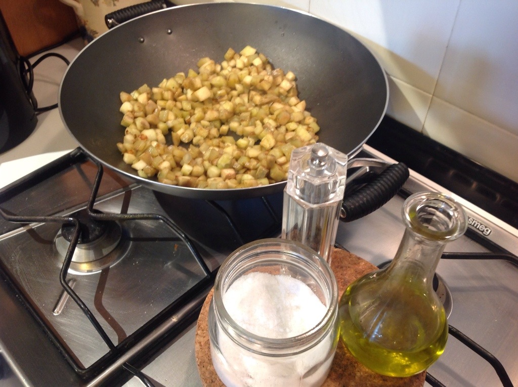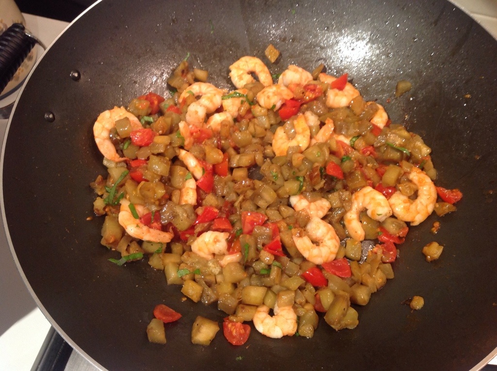 Nella pentola dove ho cotto le melanzane aggiungo un goccio di olio e lo scaldo poi verso le code e cuocio a fiamma alta per un paio di minuti, aggiungo poco sale e pepe