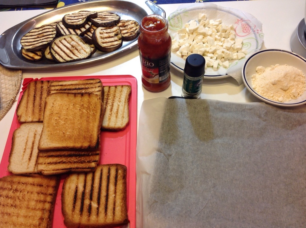 Rivesto una placca con carta forno e appoggio le fette di pane