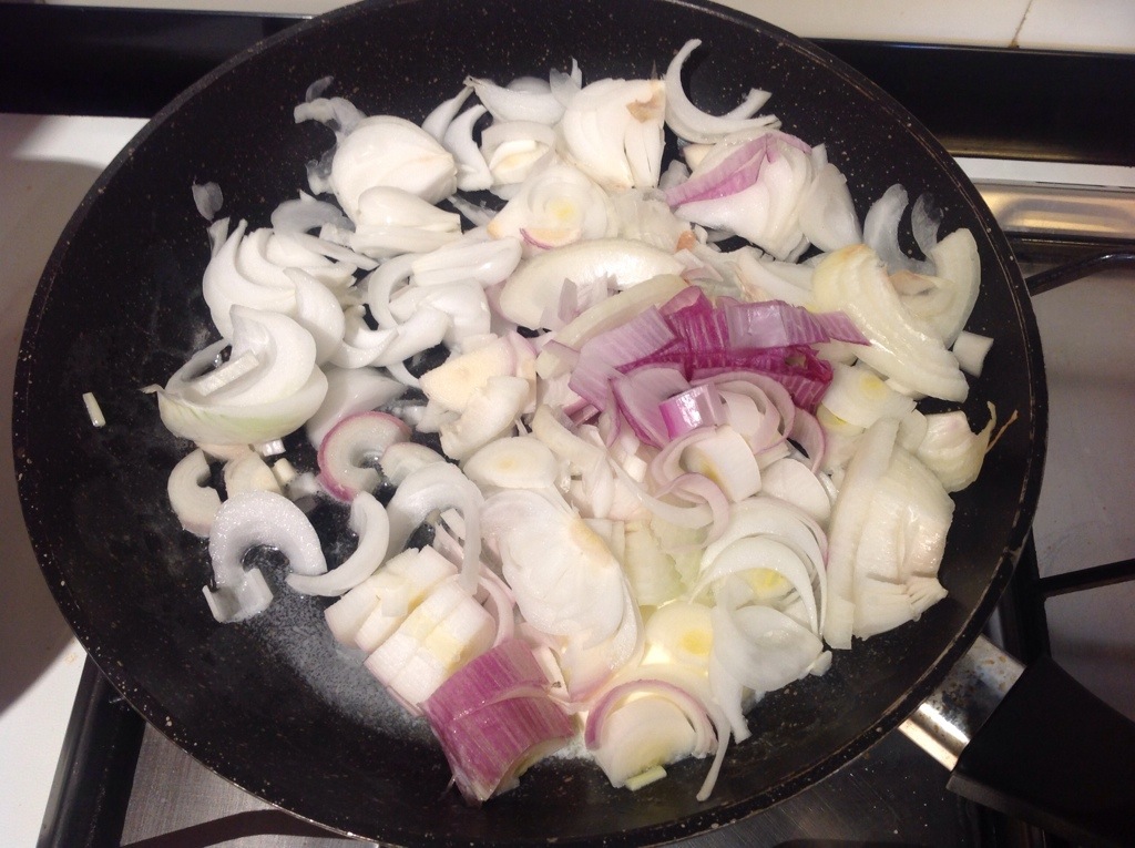Pulisco le cipolle, io ho adoperato 3 tipi di cipolle, potete adoperare quelle che preferite, le lavo e affetto e le metto in una padella con una noce di burro e lascio rosolare per 5/6 minuti