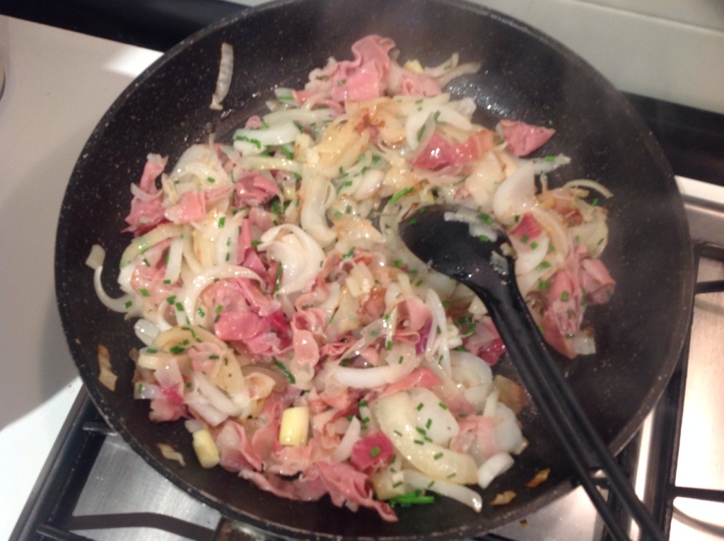 Verso le cipolle e speck livellando bene