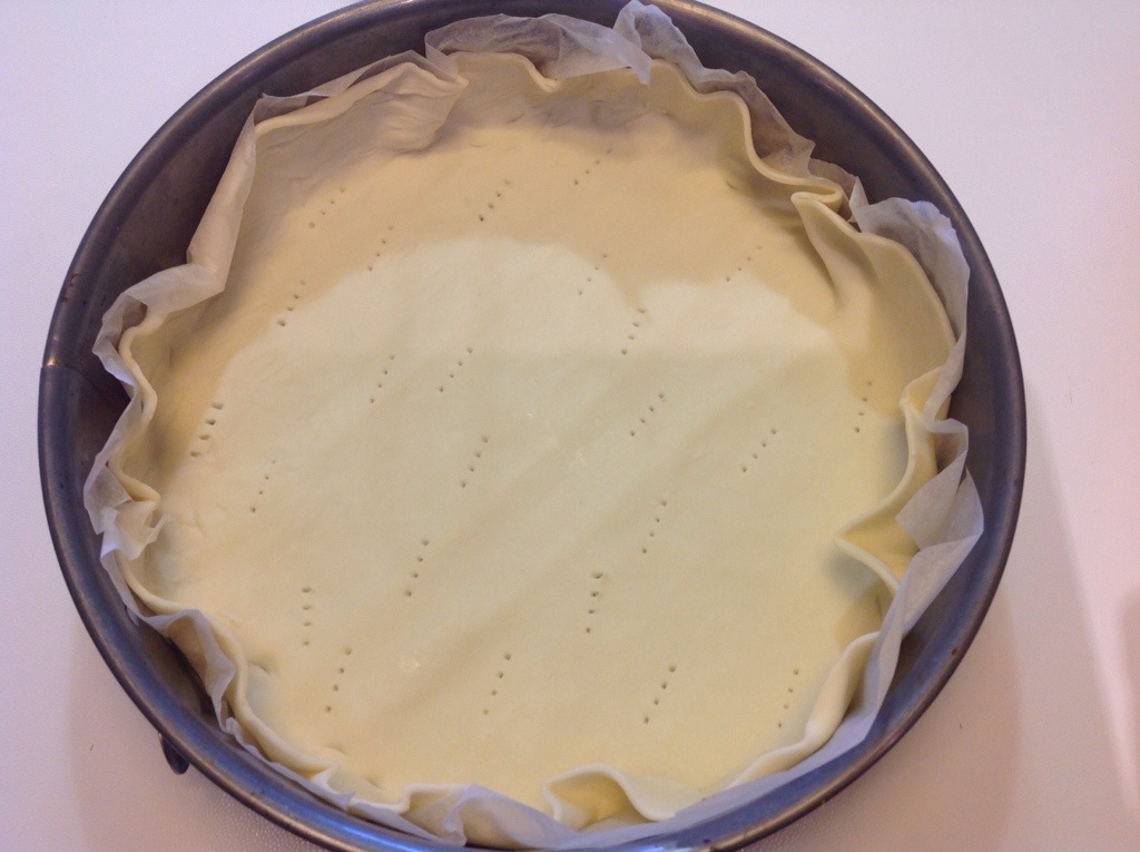 In una tortiera appoggio la sfoglia con la carta forno lasciando un bordo laterale e punzecchio il fondo