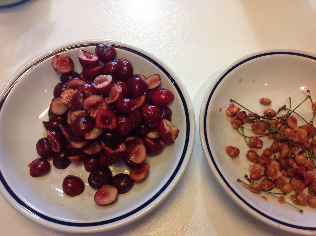 Lavo le ciliegie, le taglio a metà ed elimino il nocciolo