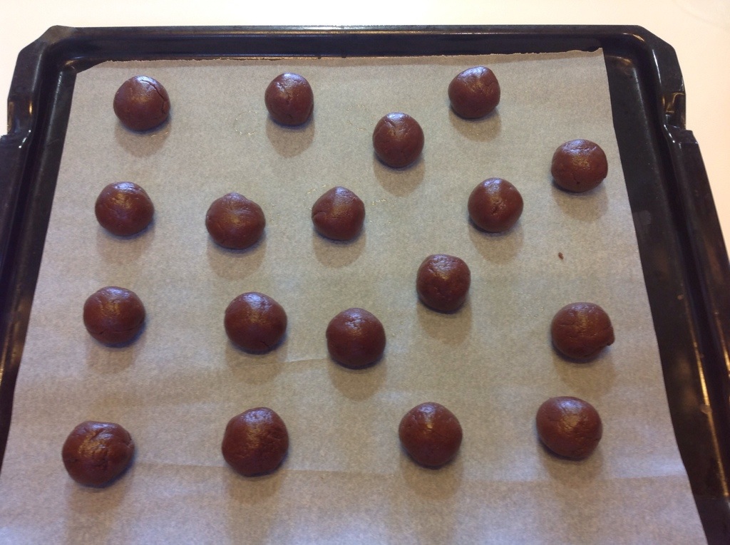 Rivesto una teglia con carta forno e formo delle palline di circa 20 grammi