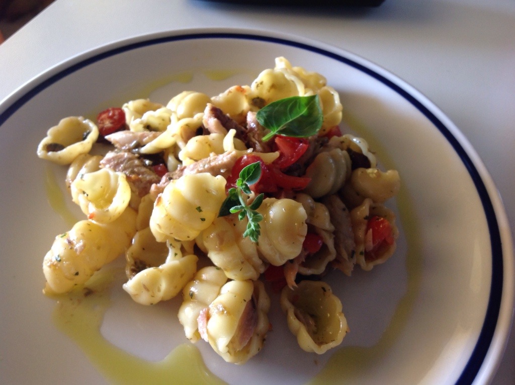 Pasta gustosa e fresca da preparare in anticipo, io l’ho servita come piatto unico, visto che la dose di sgombri era abbondante, preparandola in anticipo assorbirà tutti i sapori