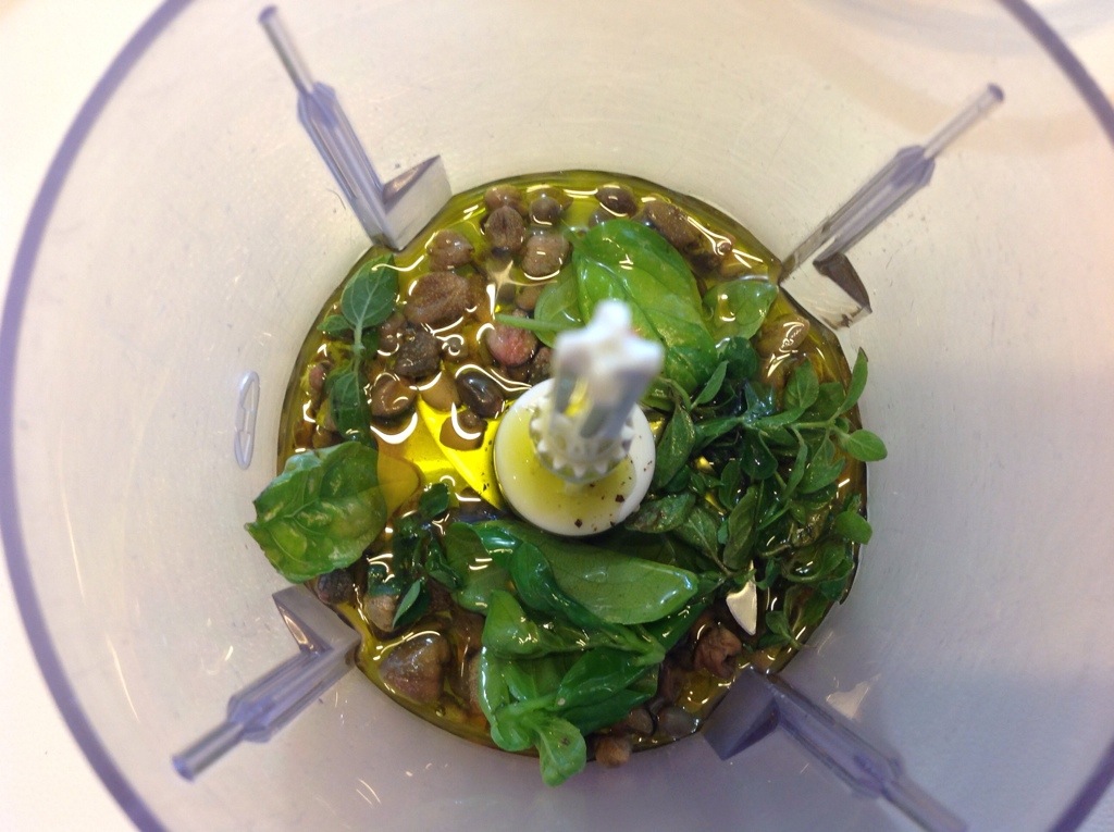 In un mixer verso i capperi rimasti, un ciuffo di basilico, l ‘origano fresco, del pepe macinato