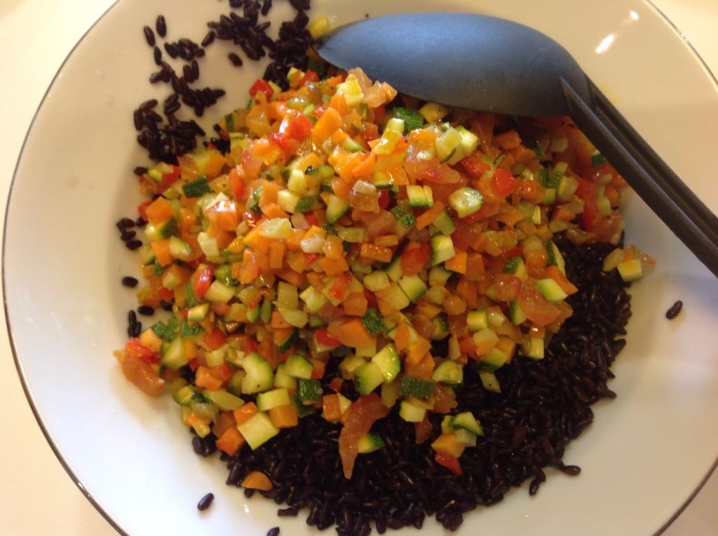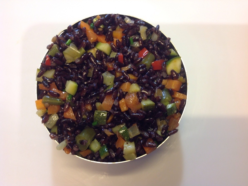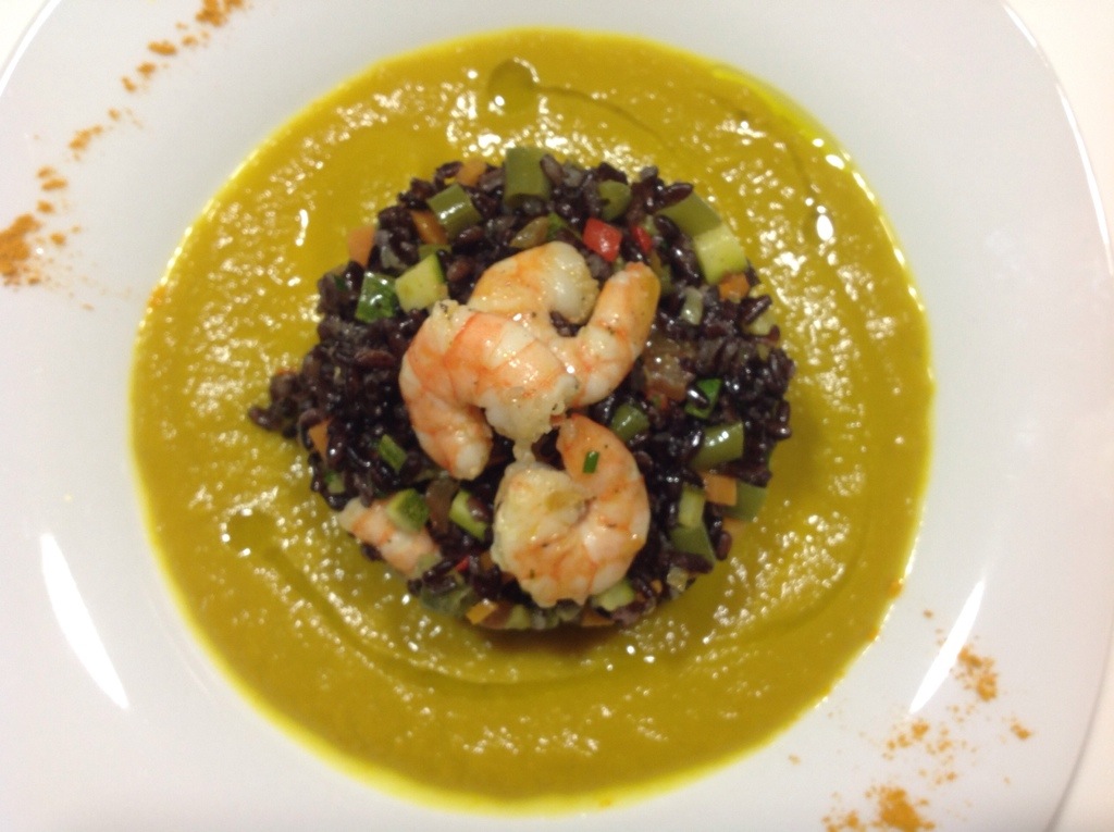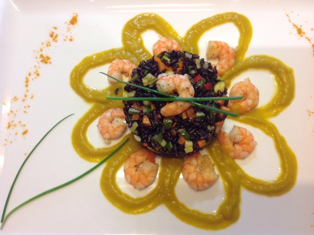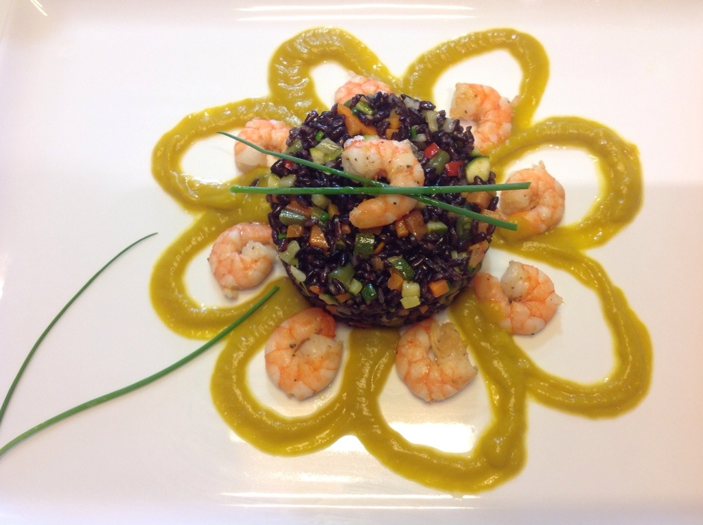 INSALATA DI RISO VENERE CON VERDURE, CODE DI GAMBERI E SALSA DI PORRI ALLA CURCUMA