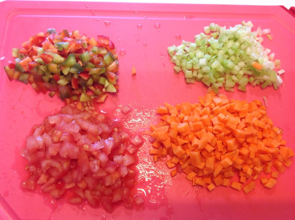 Pulisco bene le verdure lavate e pelate e le taglio a cubettini molto piccoli