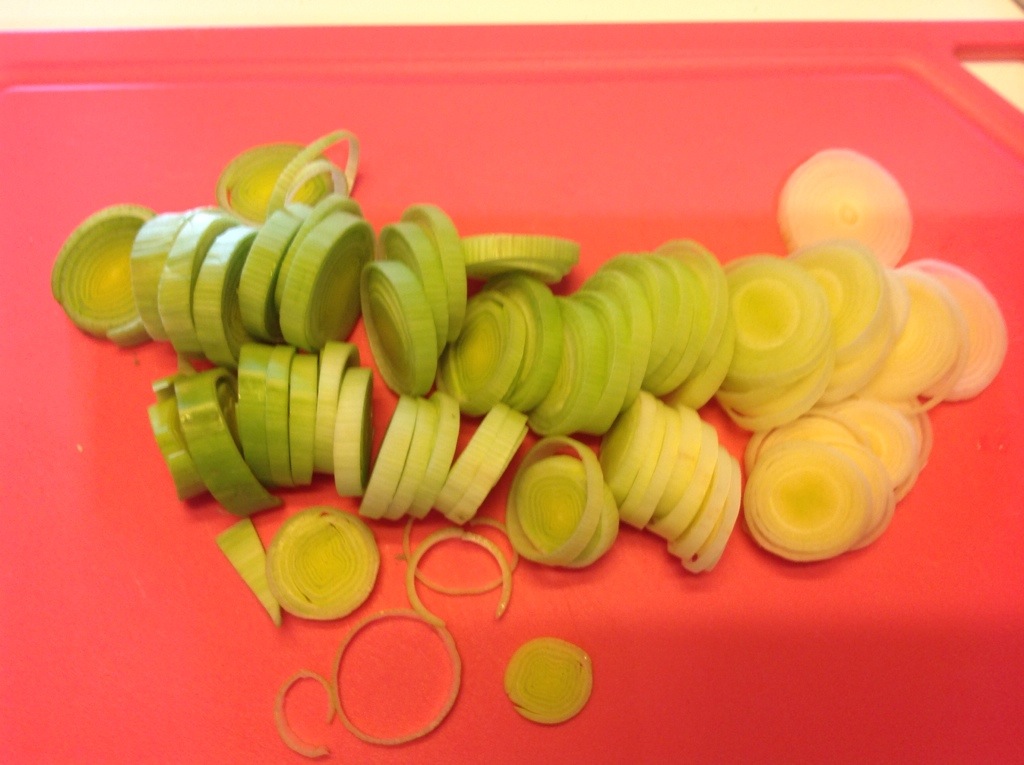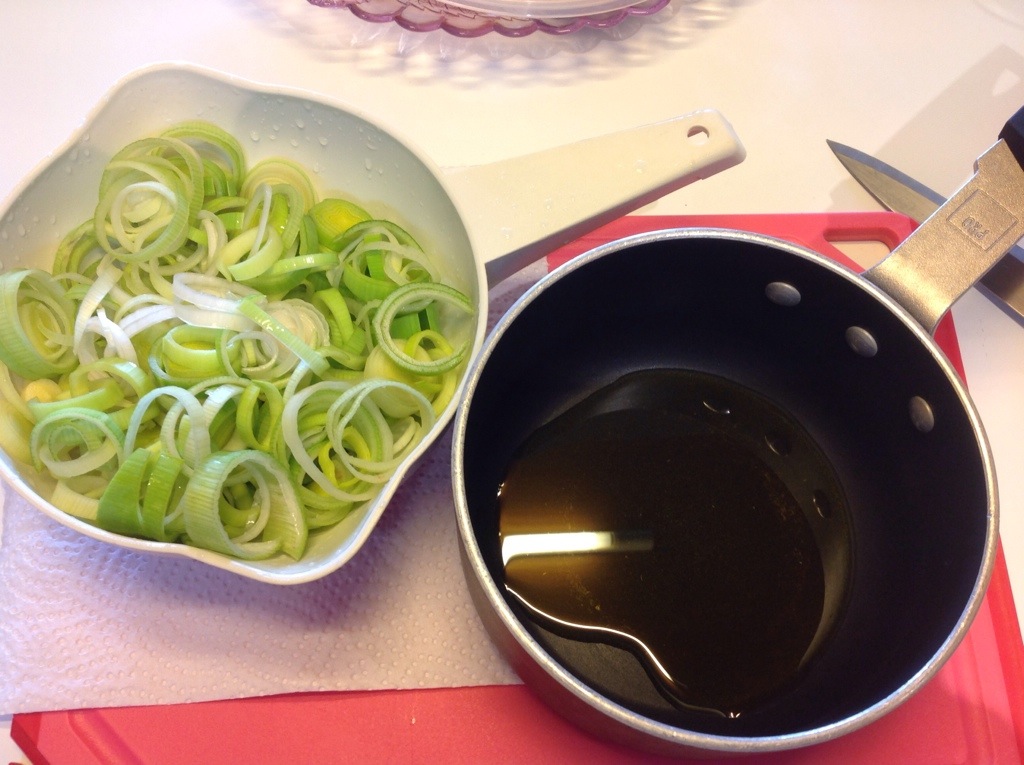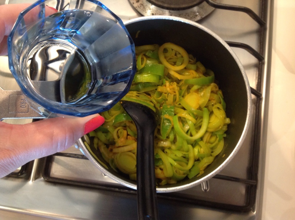 In un pentolino scaldo un goccio di olio e aggiungo i porri ben lavati