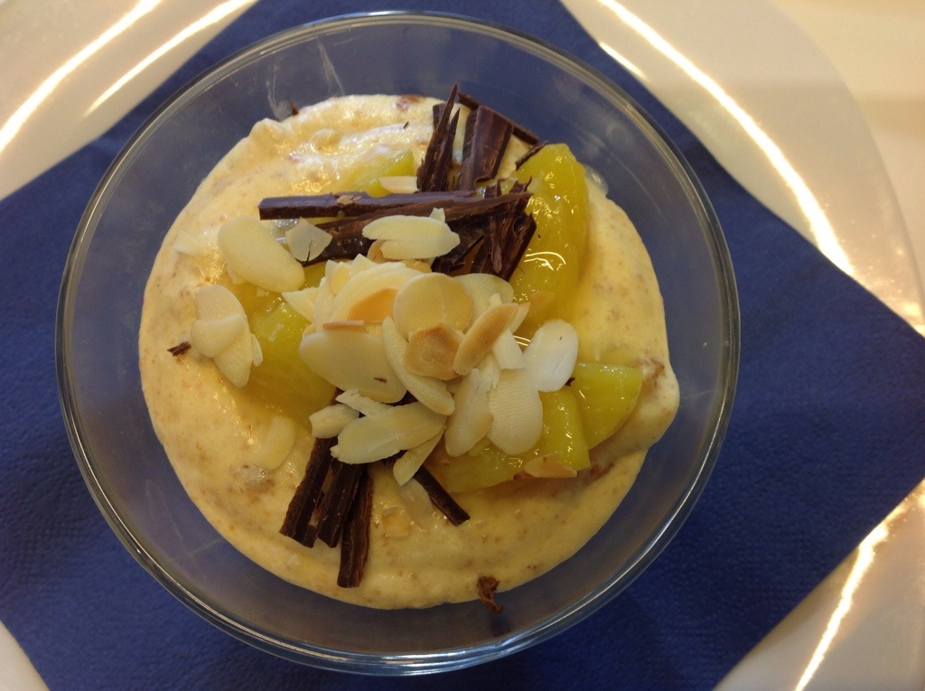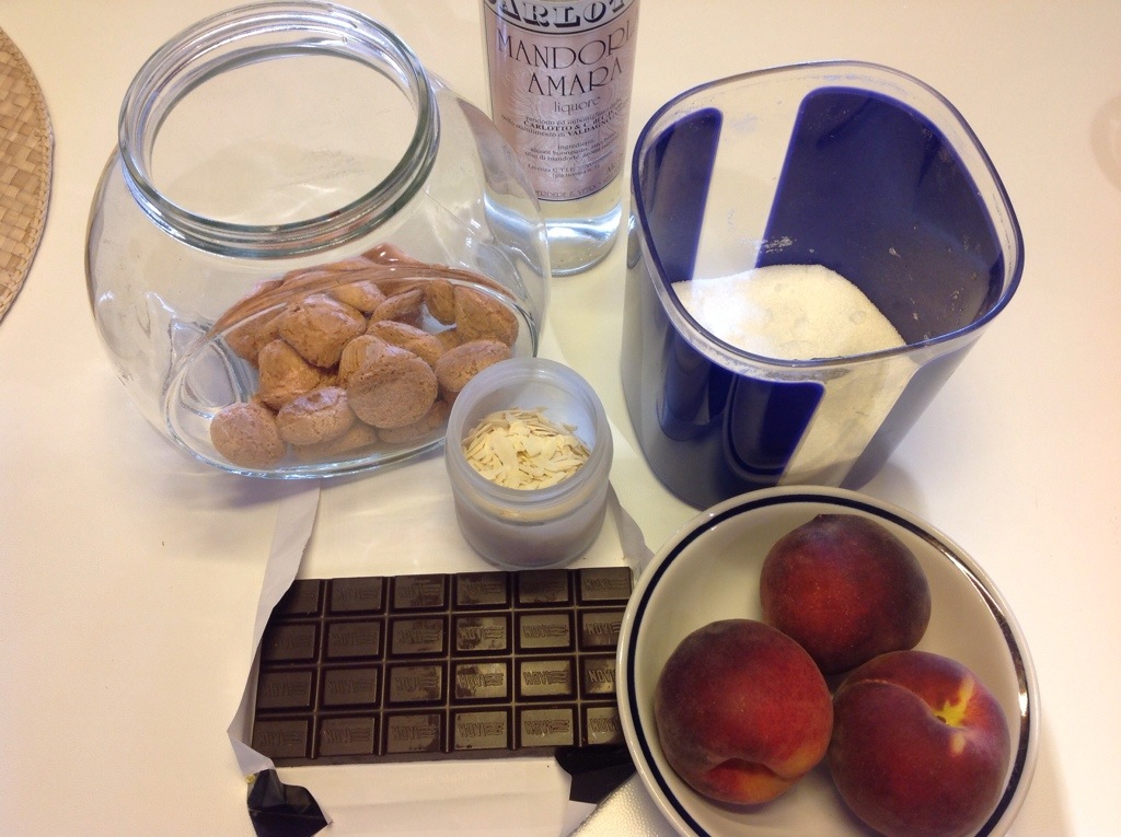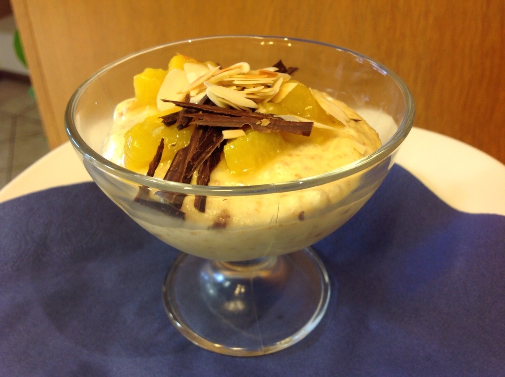 Al momento di servire aggiungo al centro di ogni coppetta un cucchiaio di pesche fredde, alcune scaglie di cioccolato fondente tagliato a coltello e le lamelle di mandorle