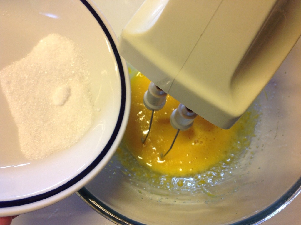 Monto i tuorli con 35 gr di zucchero della dose finché diventano chiari e spumosi