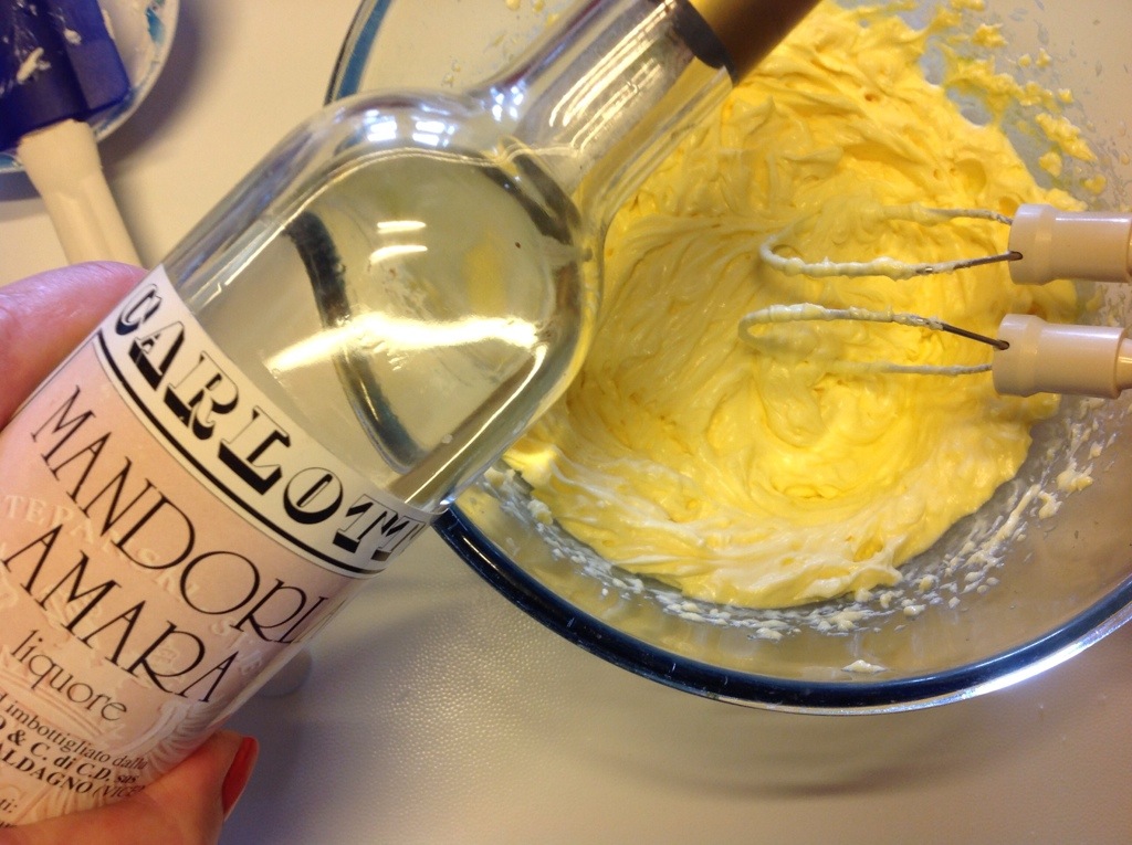 Continuo a montare, aggiungo un goccio di liquore alla mandorla, è facoltativo, mi fermo quando la crema è ben amalgamata e gonfia