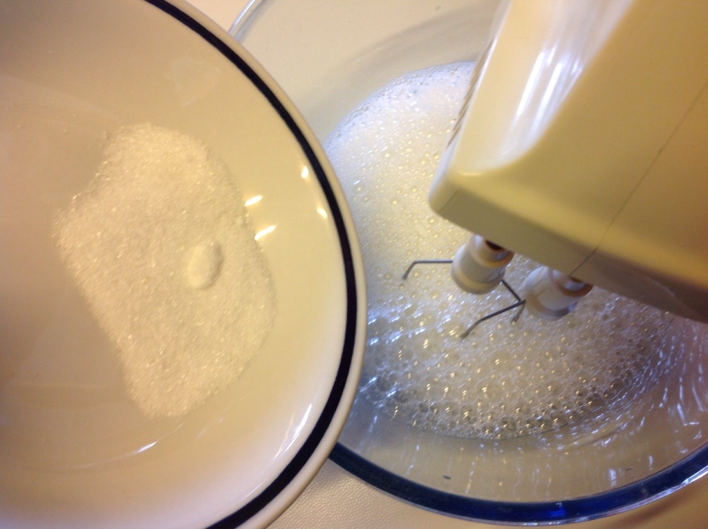 Monto le chiare a neve aggiungendo i 15 grammi di zucchero sempre montando