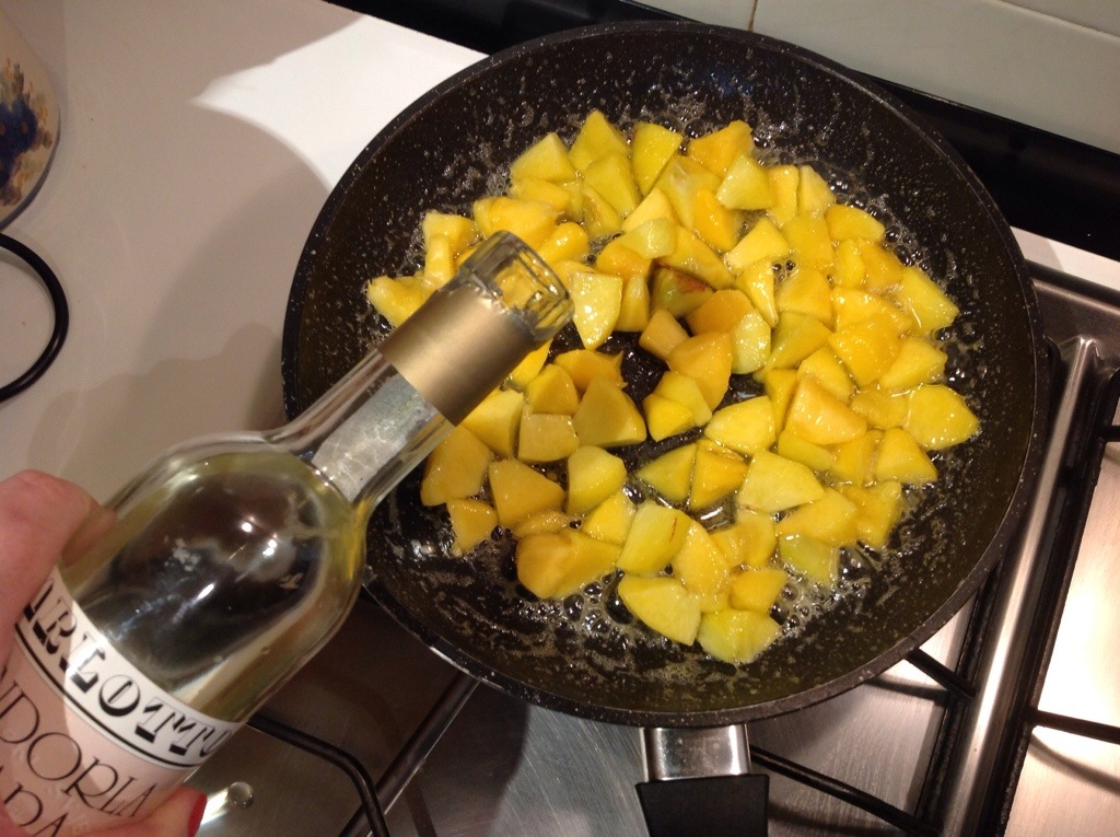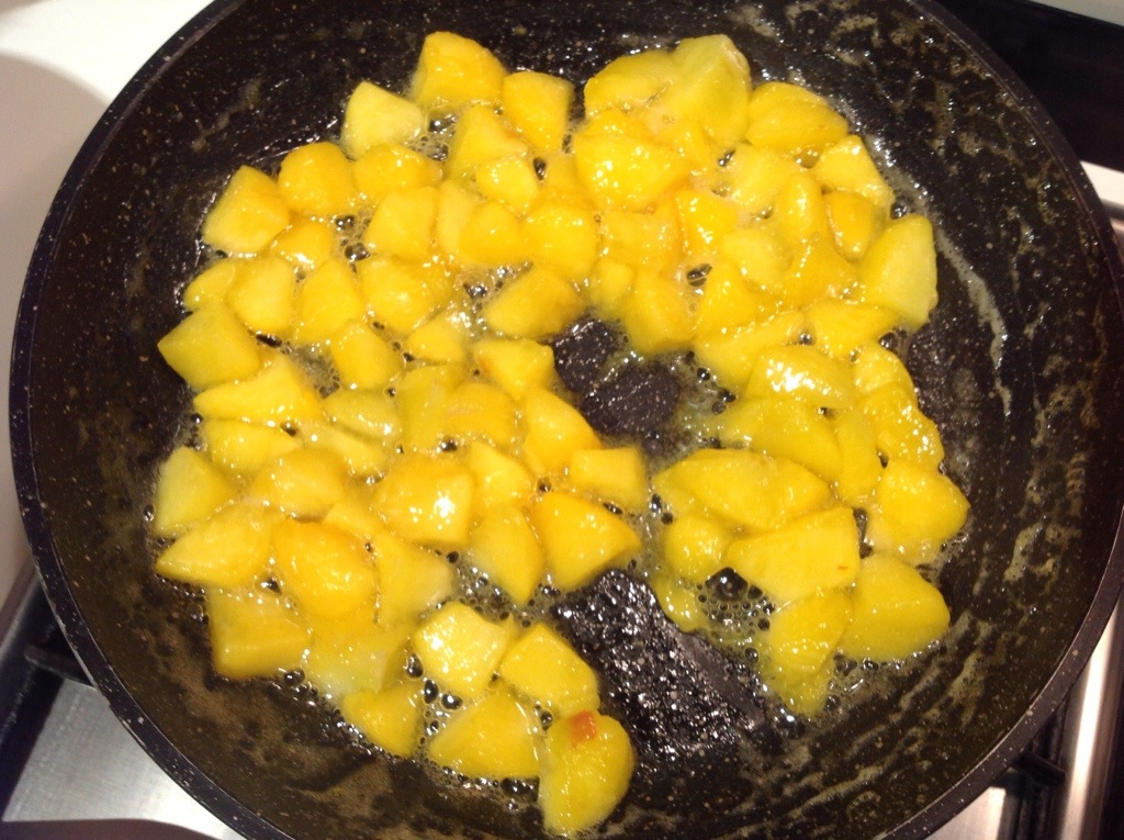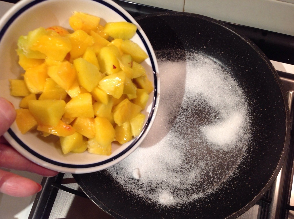 Sbuccio le pesche e le taglio a cubetti versandole in una padella calda con lo zucchero