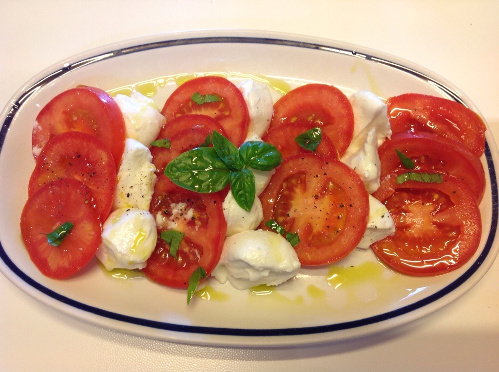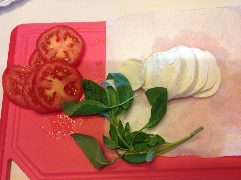 Il piatto è semplicissimo, preparo una torretta alternando una fetta di pomodoro, poco sale, una fetta di mozzarella e una di basilico, poi ancora uno strato, finisco con alcune foglie di basilico, sale, pepe e olio extravergine d’oliva, nel mio caso del Garda, che è fantastico