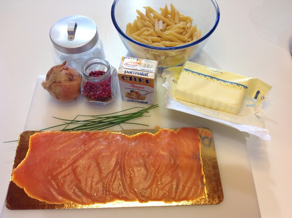 Verso la pasta nei piatti,aggiungo sopra il salmone a striscioline, qualche filo di erba cipollina e un pizzico di pepe rosa
