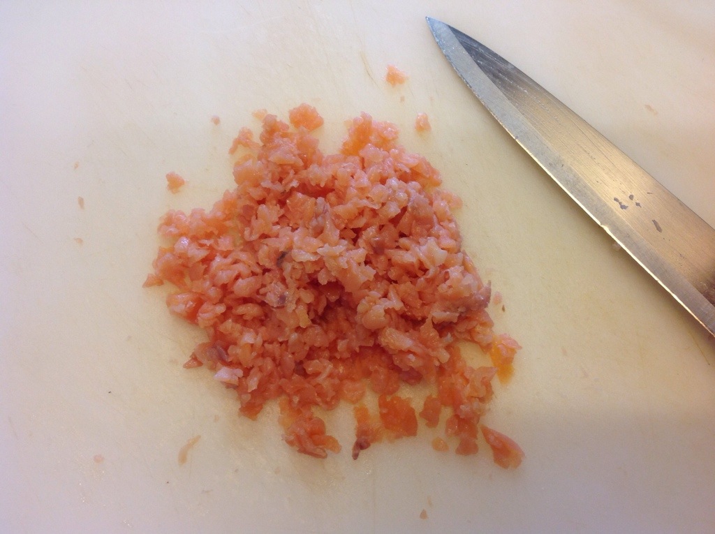3 fettine di salmone della dose le taglio a striscioline e le tengo da parte per la decorazione