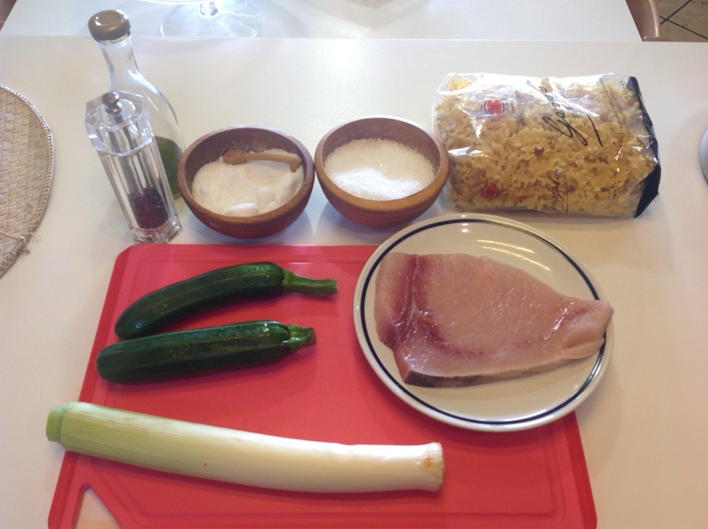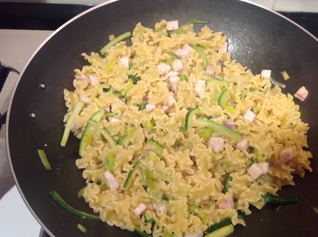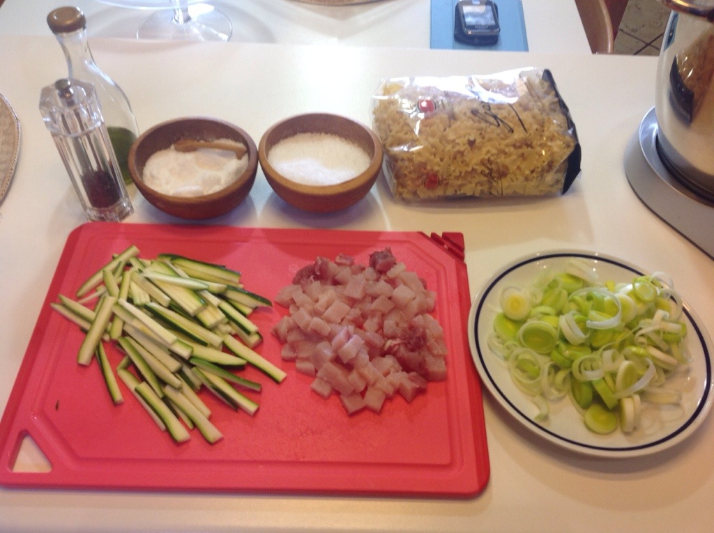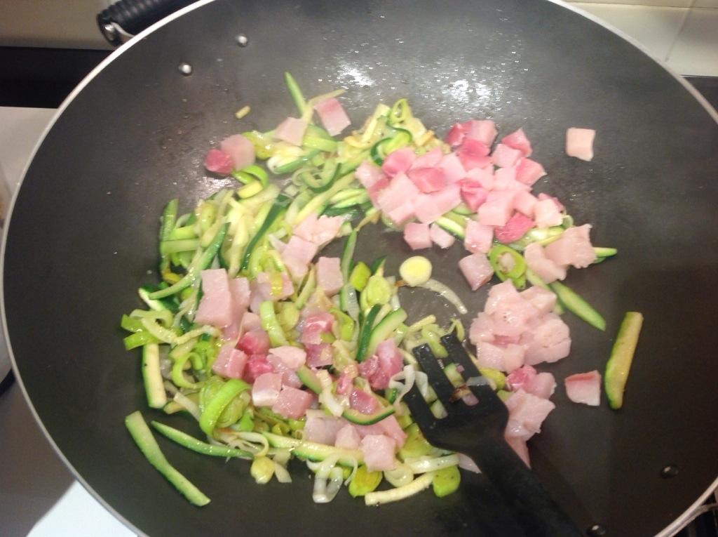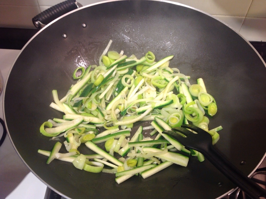 In una padella scaldo dell”olio extravergine, aggiungo il porro e le zucchine, tenendo la fiamma alta porto a cottura lasciando però le verdure croccanti