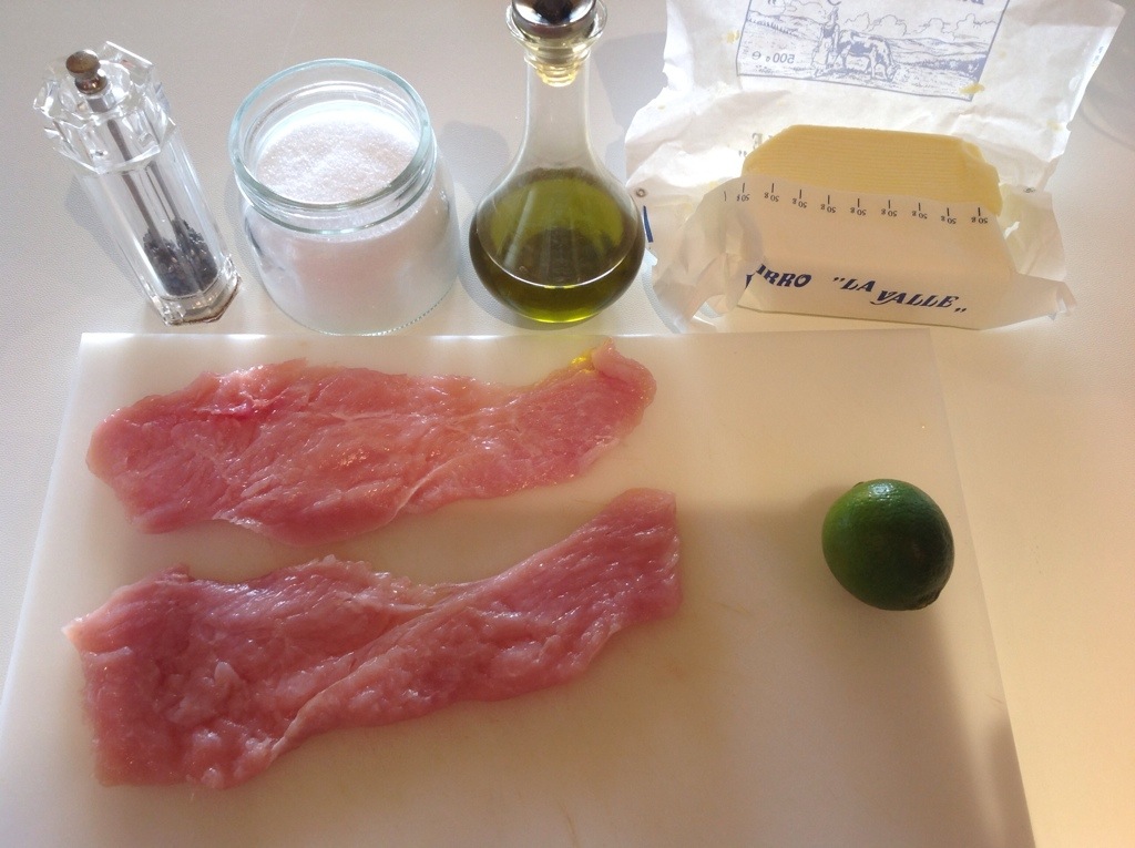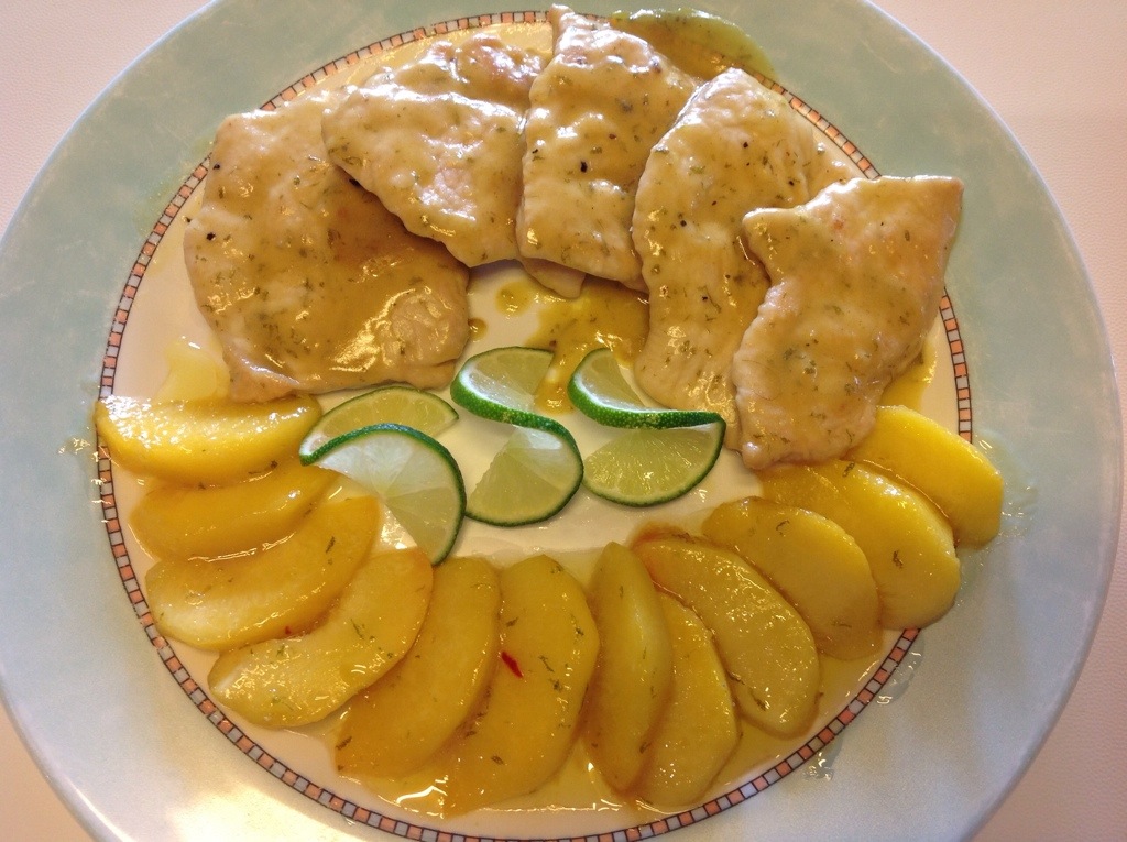 Dispongo sul piatto le scaloppine, a raggiera le pesche e per guarnire qualche fettina li lime