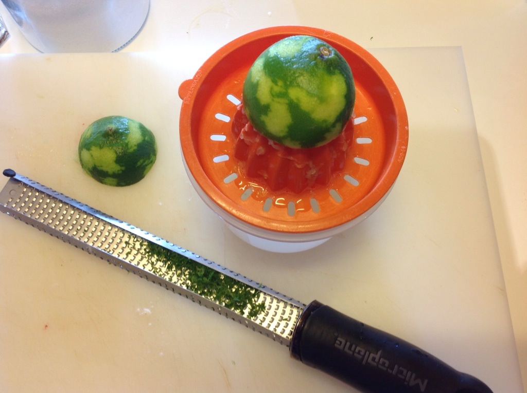 Massaggio bene il lime per ammorbidirlo, con una grattugia tolgo la parte verde della buccia e lo spremo