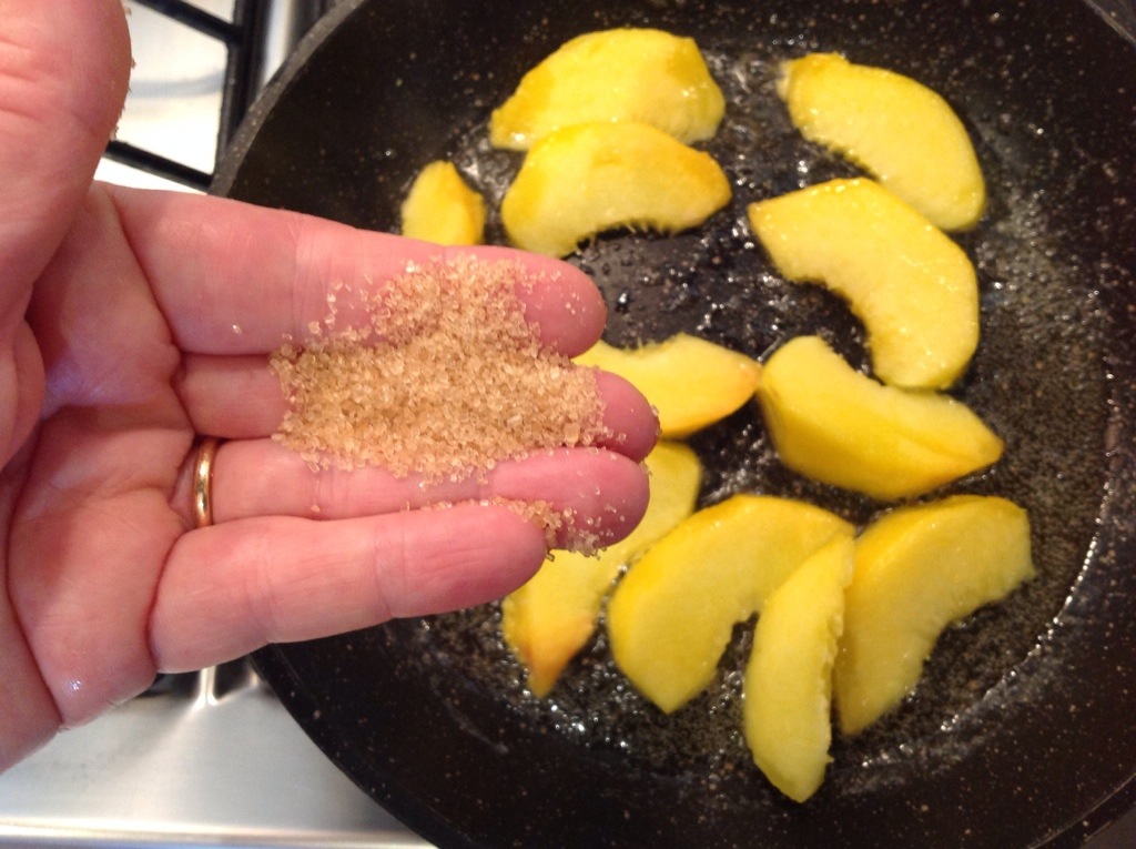 Quando sfrigola aggiungo le pesche e una spolverata di zucchero di canna