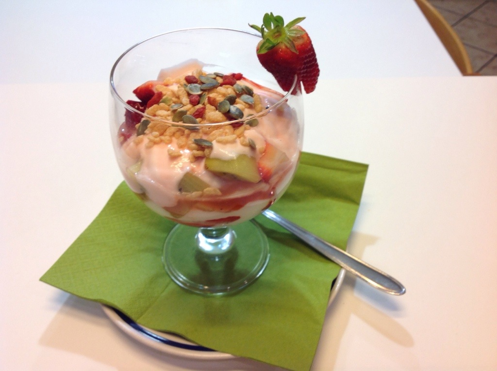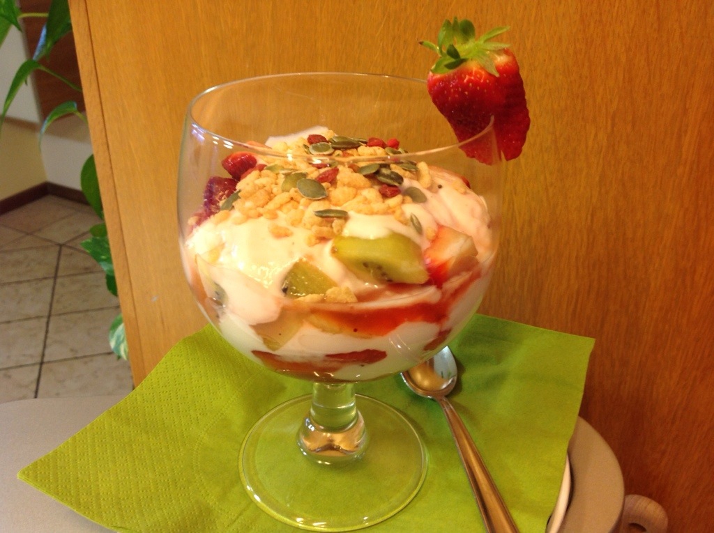 Quando ho voglia di una cena leggera dopo un bel pranzo, questa coppa é l’ideale, io preparo lo yogurt in casa ma va bene anche quello che si compera, può diventare anche un fresco dessert o un’ottima colazione