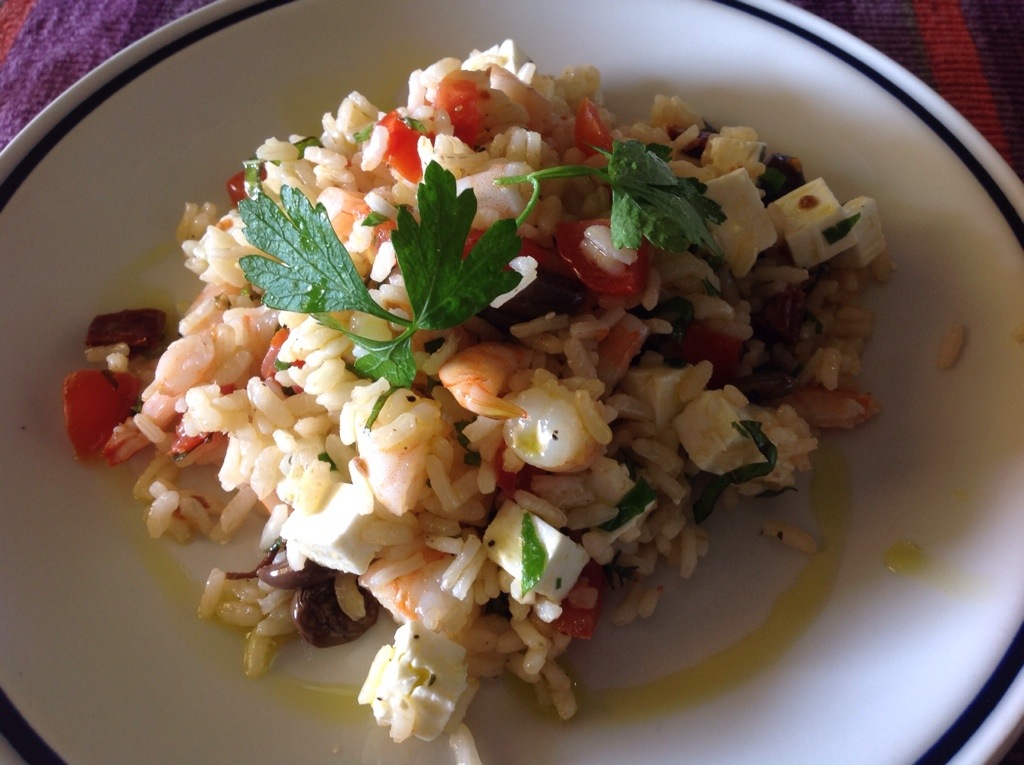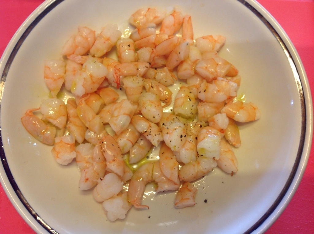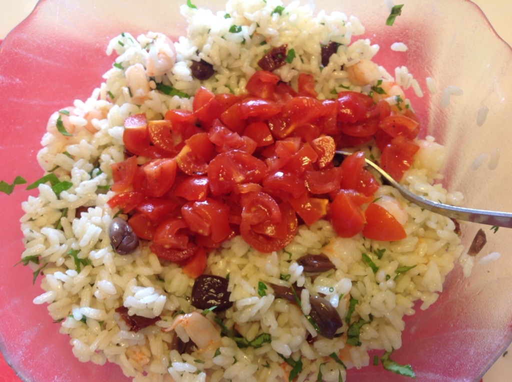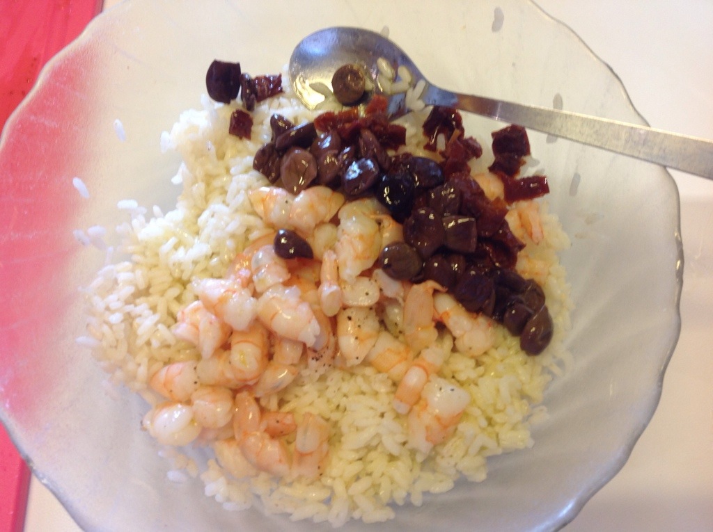 Lo verso in una ciotola, aggiungo i gamberi a pezzetti, le olive, i pomodori secchi