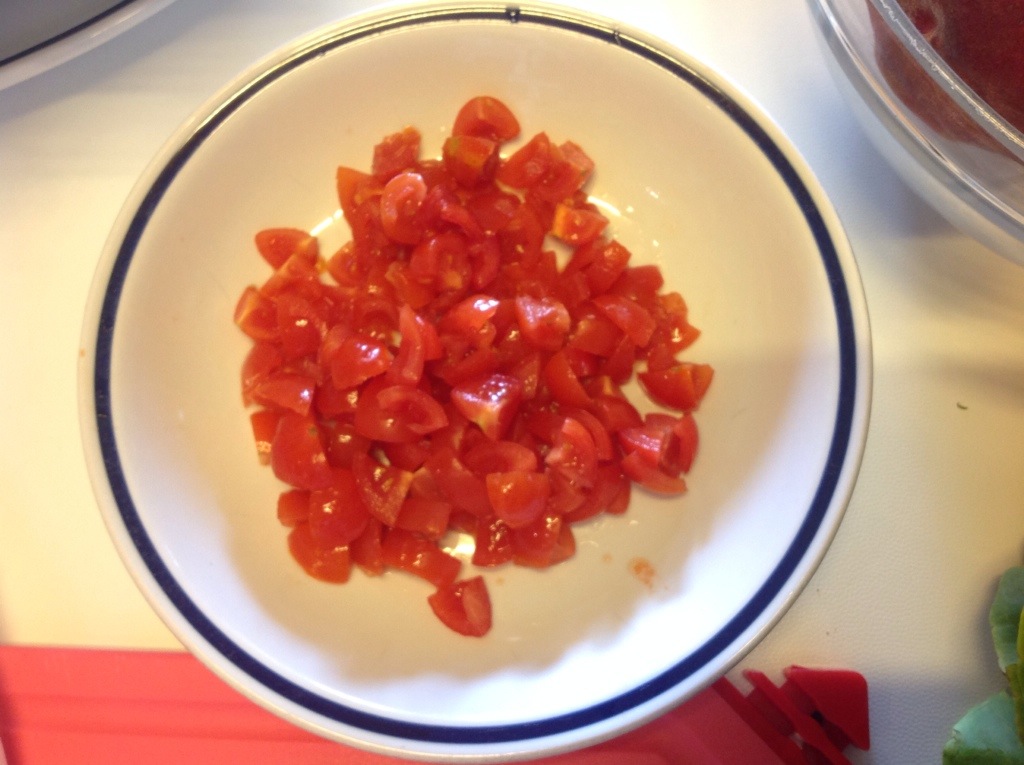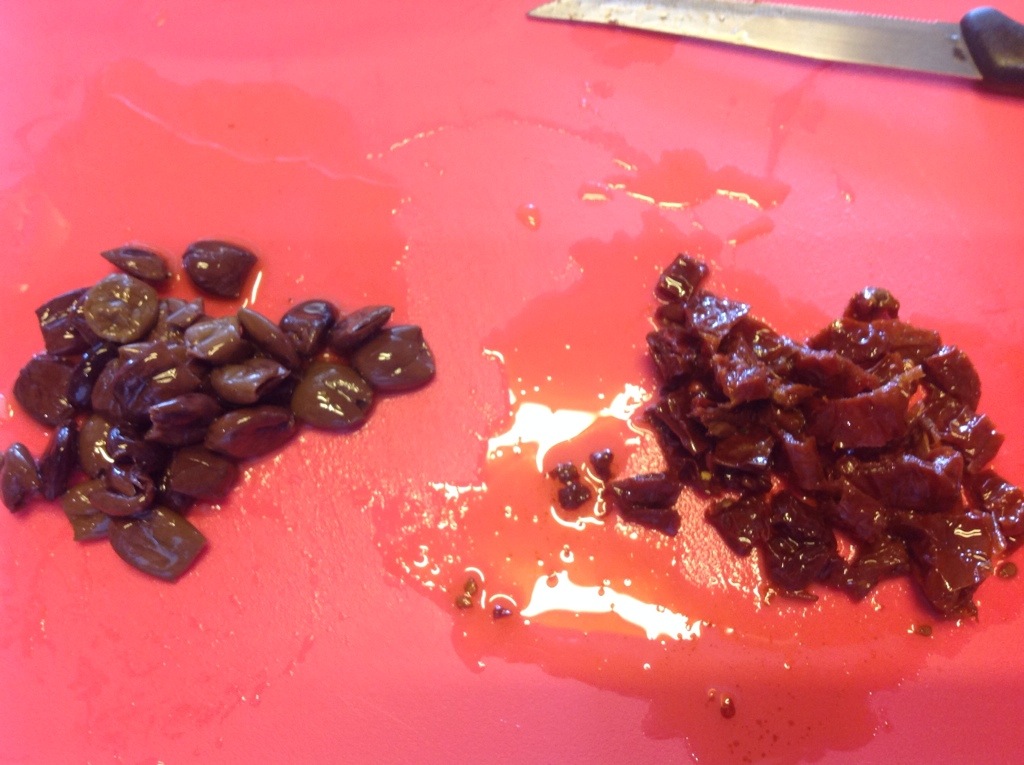 Tolgo le olive dall’olio e taglio a pezzettini i pomodorini