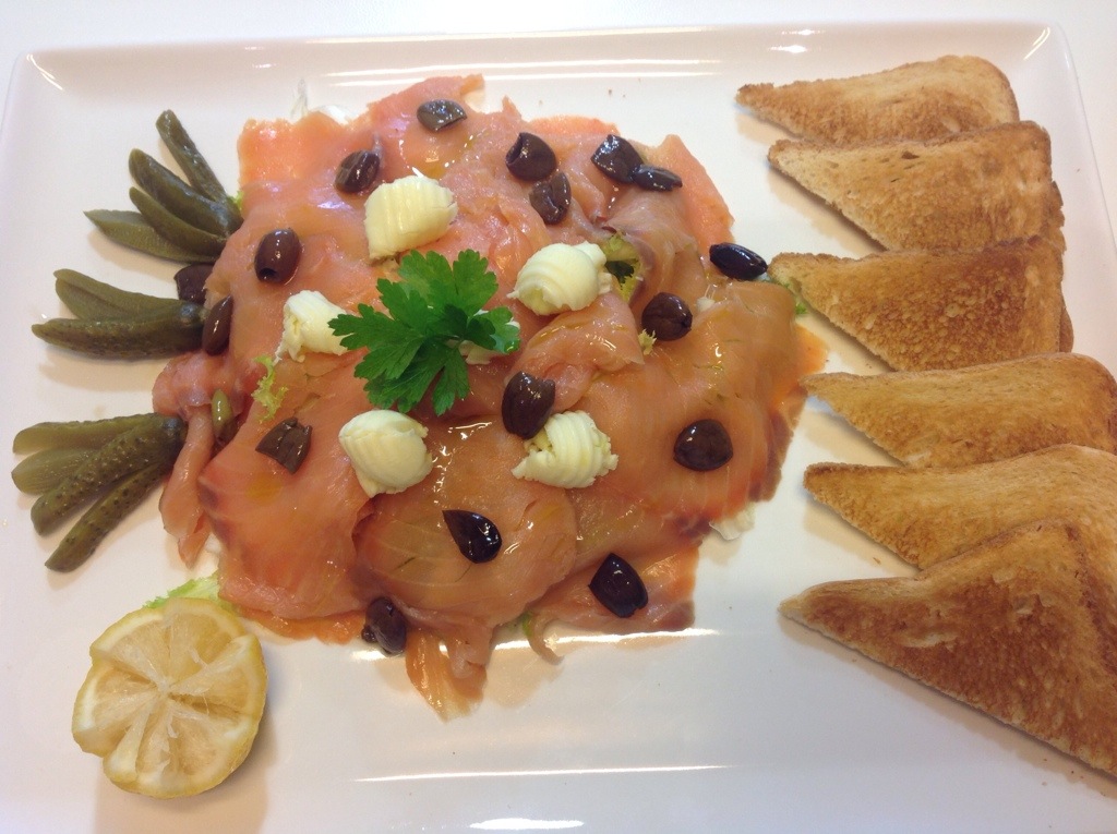 CARPACCIO DI SALMONE AFFUMICATO CON OLIVE TAGGIASCHE