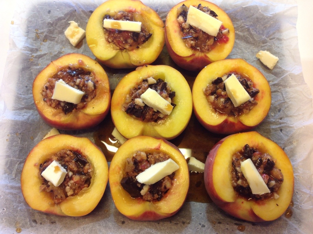 Riempio con il composto i fori delle pesche e le appoggio su una teglia ricoperta da un foglio di carta forno bagnato e strizzato