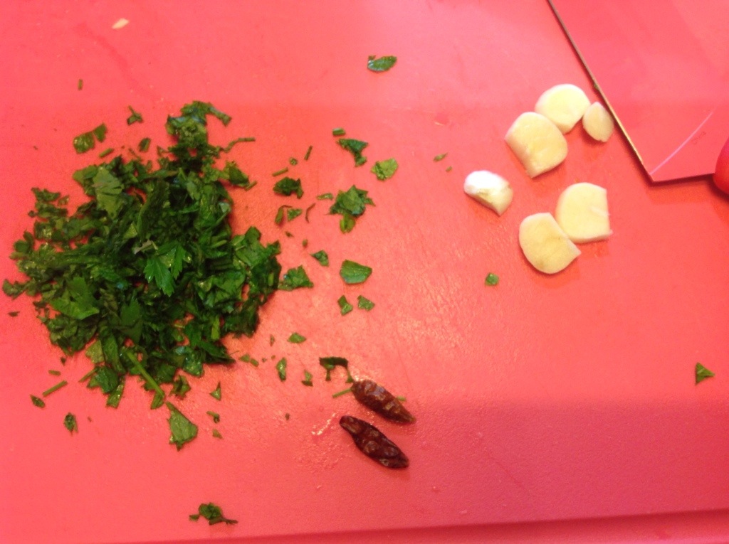 Le scolo e le verso in una ciotola, preparo del prezzemolo tritato, uno spicchio di aglio a fettine e 2 peperoncini