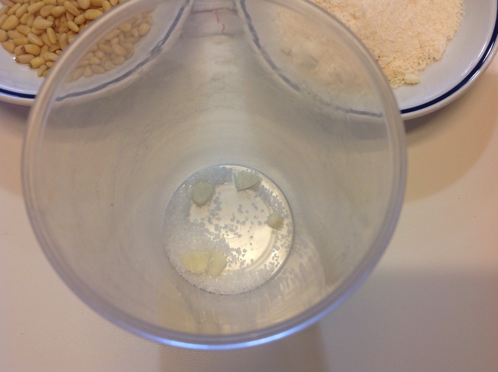 Nel bicchiere del mixer ho messo il sale grosso e l’aglio a fettine