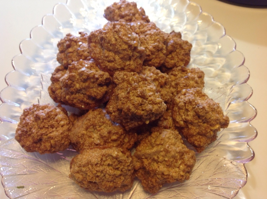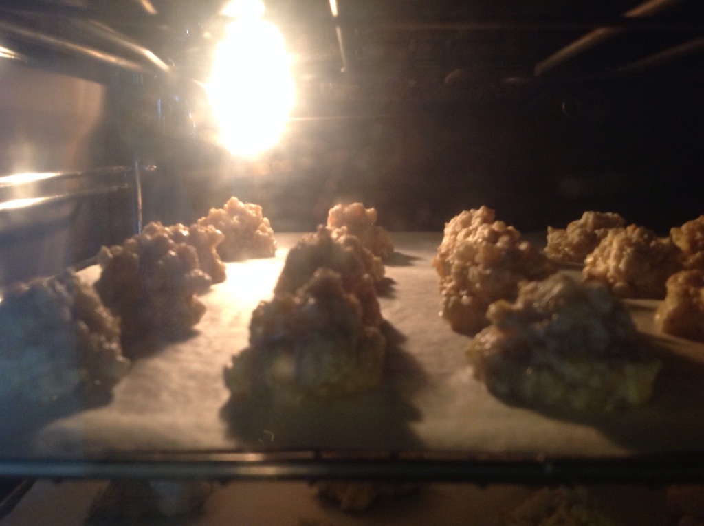 Preparo le teglie rivestite di carta forno e faccio tanti mucchietti di impasto distanziati fra loro e inforno a 140/160 gr per circa 25/30 minuti