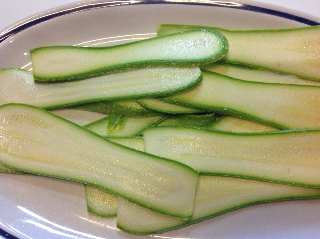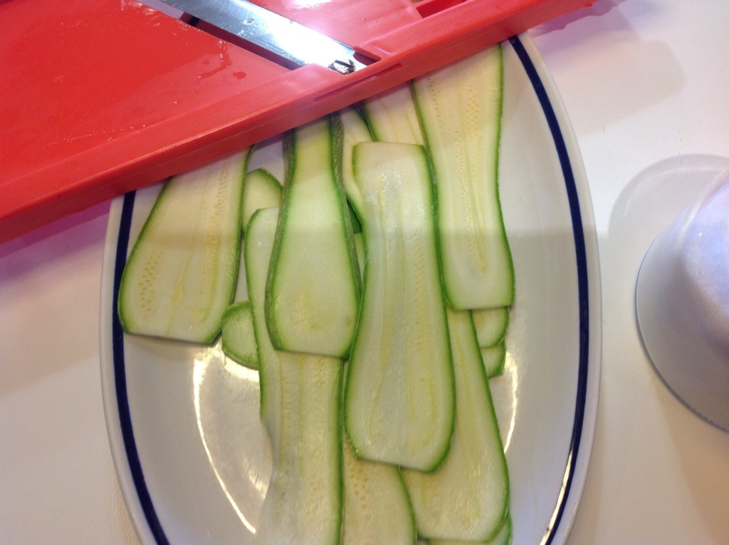 Con una mandolina taglio a nastro una o due zucchine, devo ottenere 12 fettine sottili