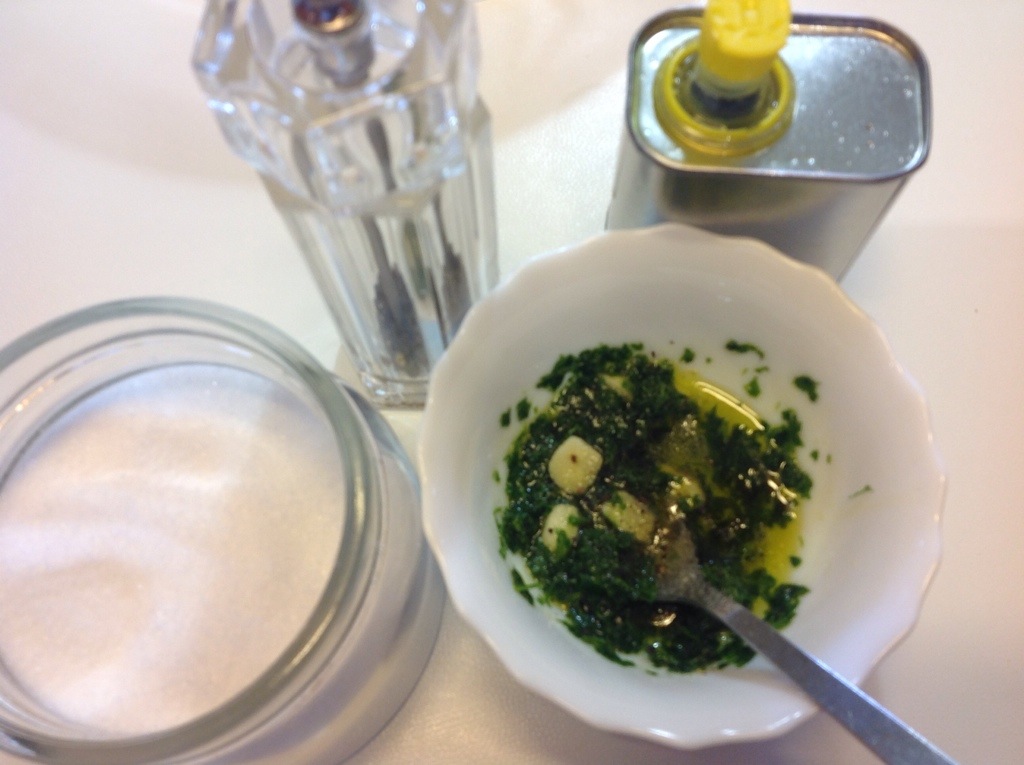 In una ciotolina metto il prezzemolo tritato con lo spicchio di aglio a fettine, sale, pepe e olio extravergine e mescolo