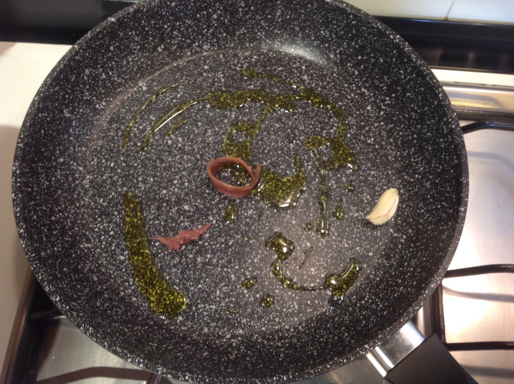In una padella verso un goccio di olio, lo spicchio di aglio e due filetti di acciughe scaldo e le faccio sciogliere