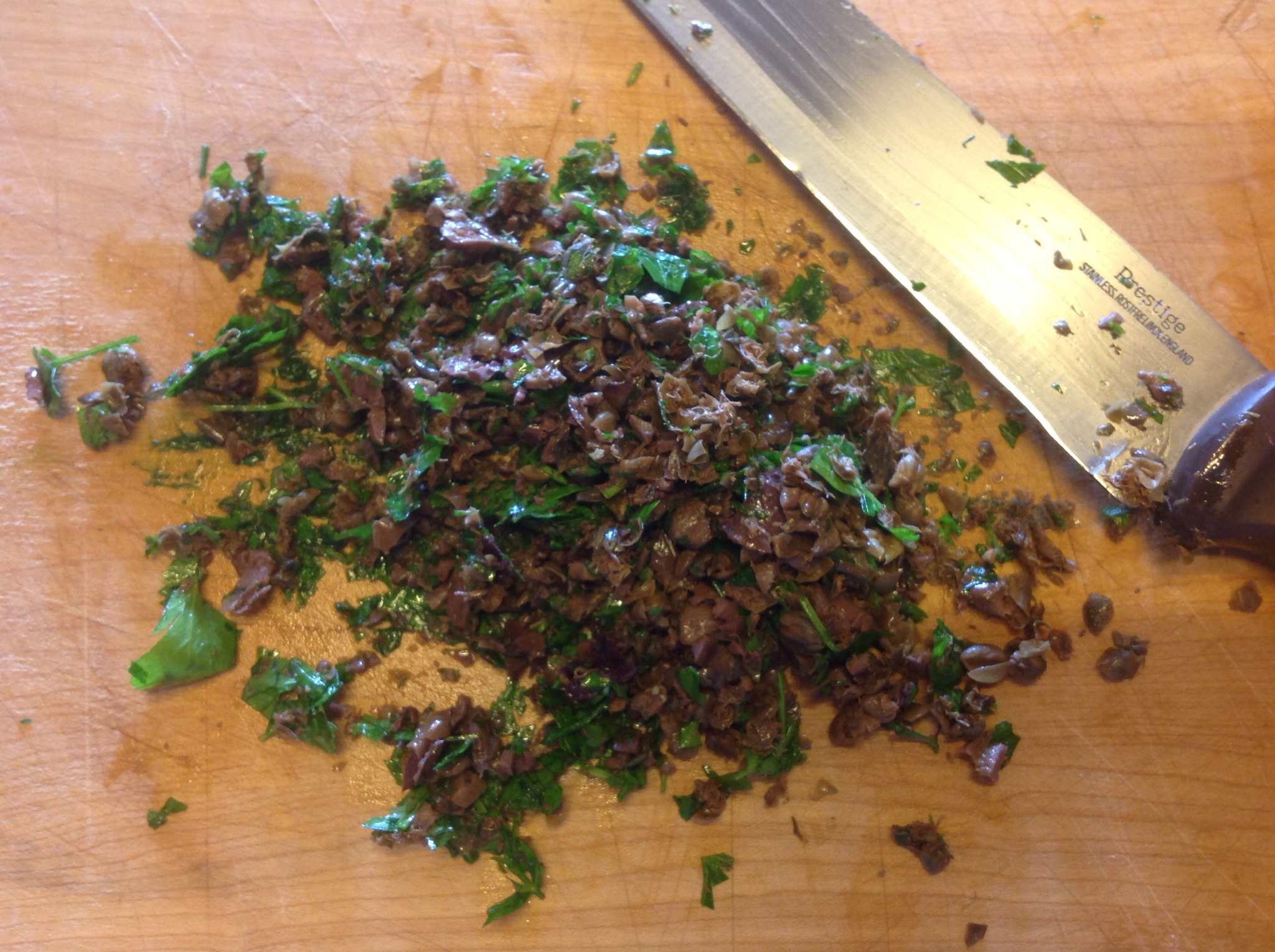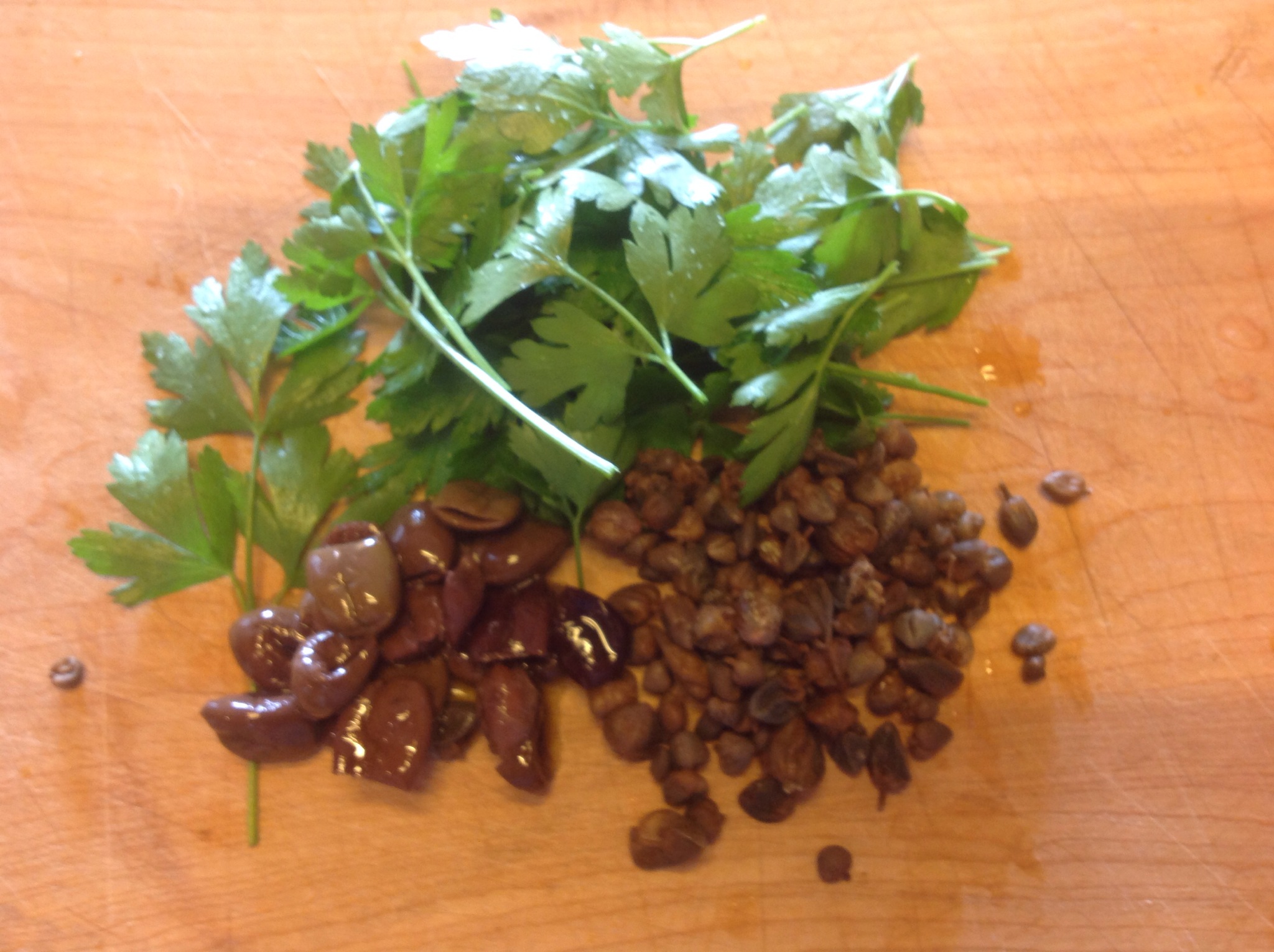 Lavo il prezzemolo, strizzo i capperi dall’acqua e aggiungo le olive