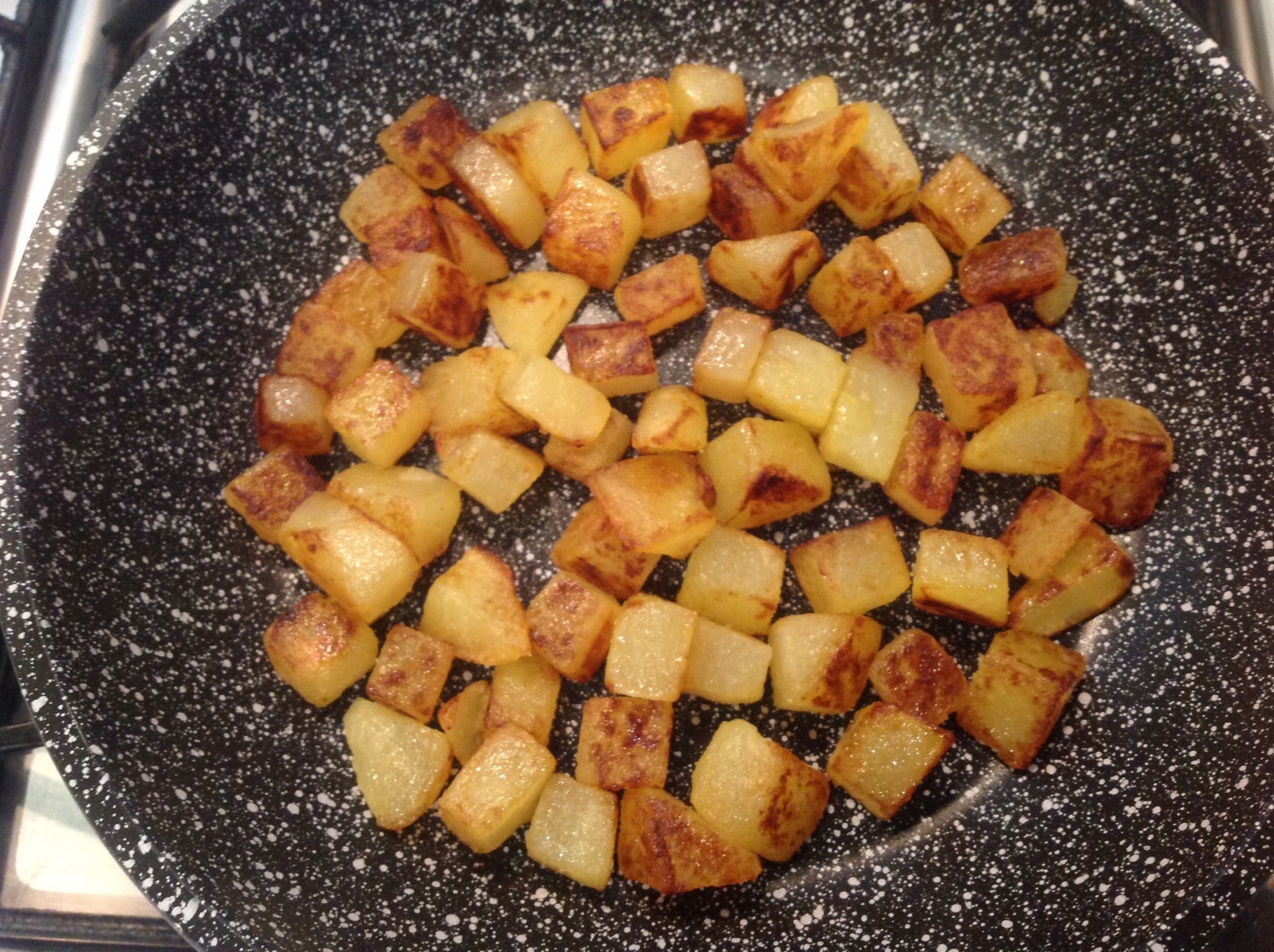 Come contorno ho preparato dei cubetti di patate che ho prima lessato per 5 minuti poi rosolato in padella con un filo di olio e poco sale