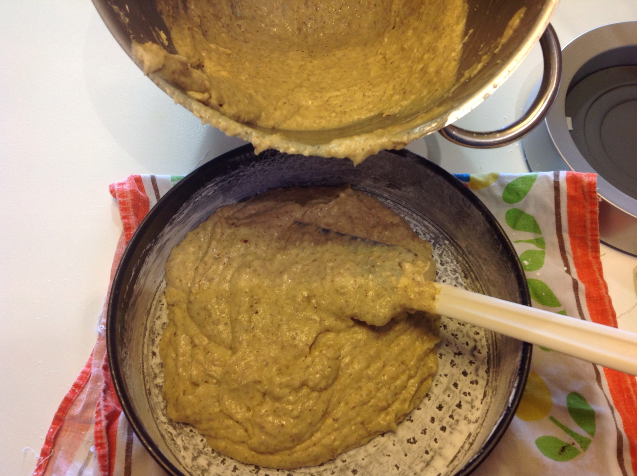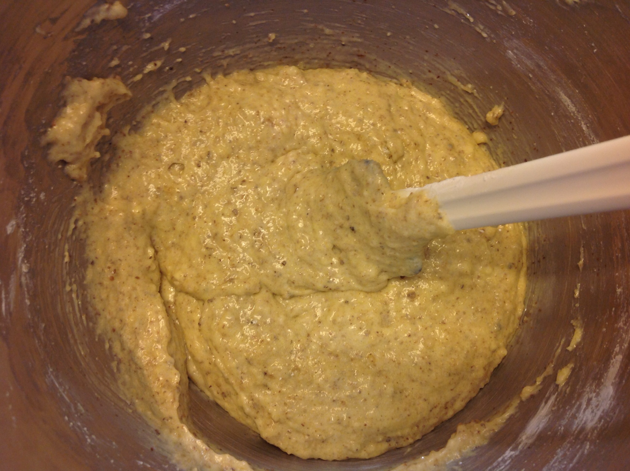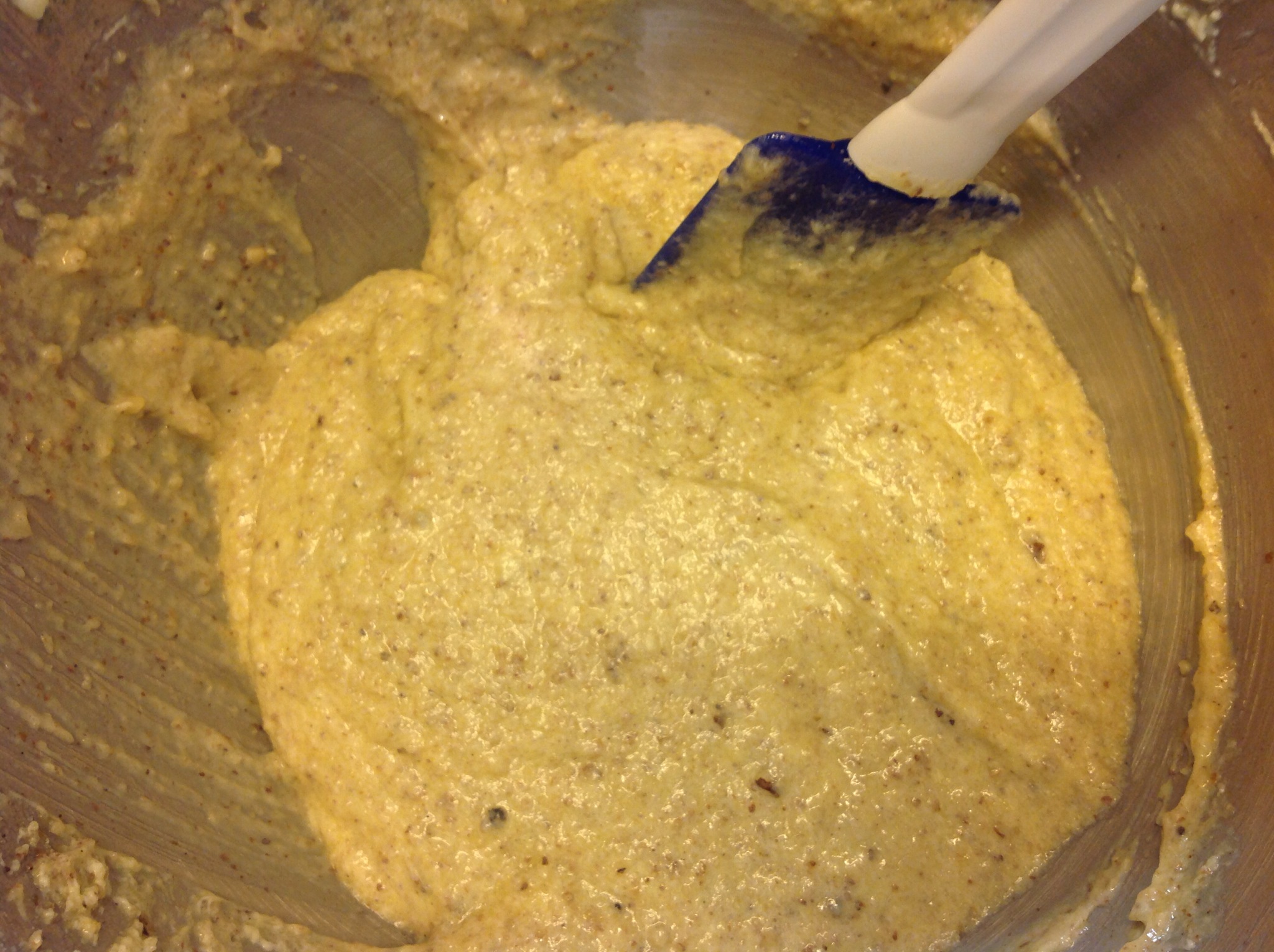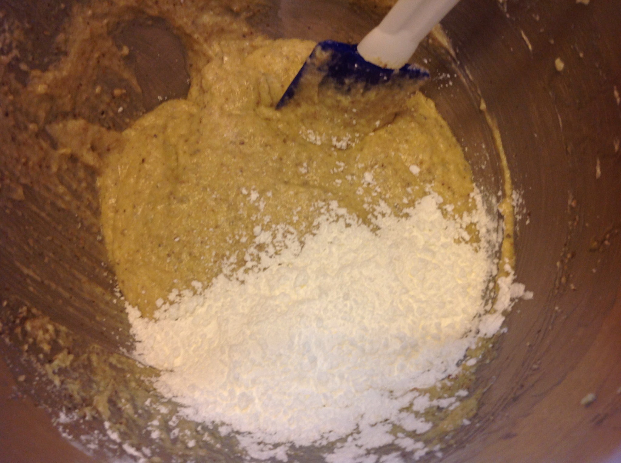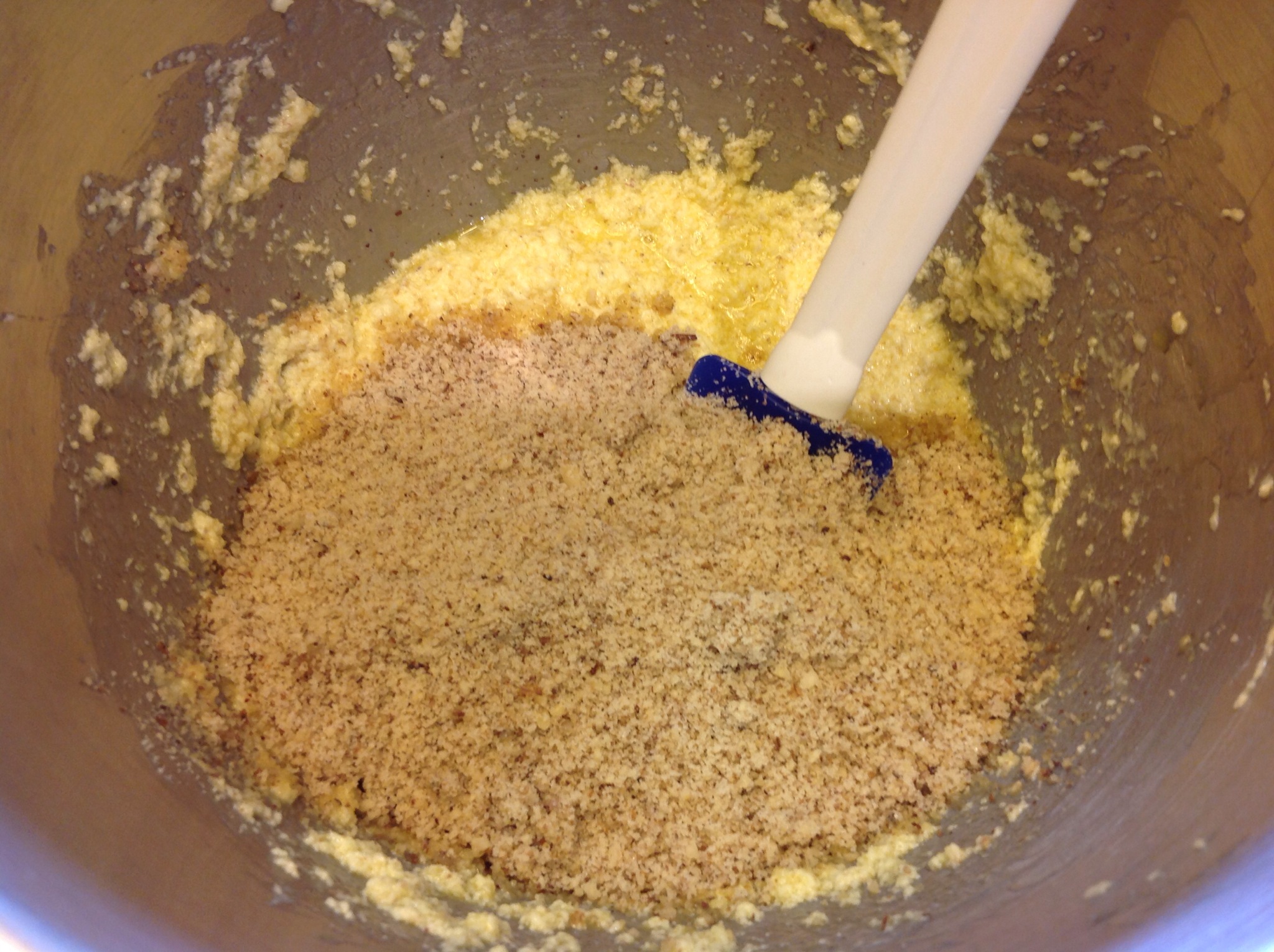 Aggiungo al burro le noci, sembra un impasto un po’ slegato ma quando aggiungo le noci tritate si unirà tutto, mescolo con una spatola
