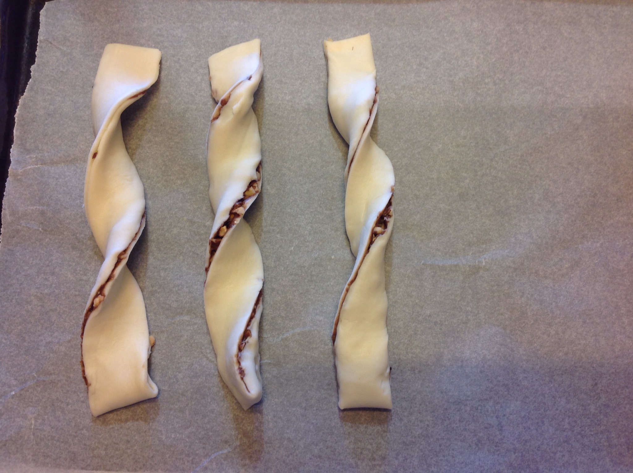 Rivesto una teglia con carta forno e appoggio ogni striscia di pasta farcita arrotolandola