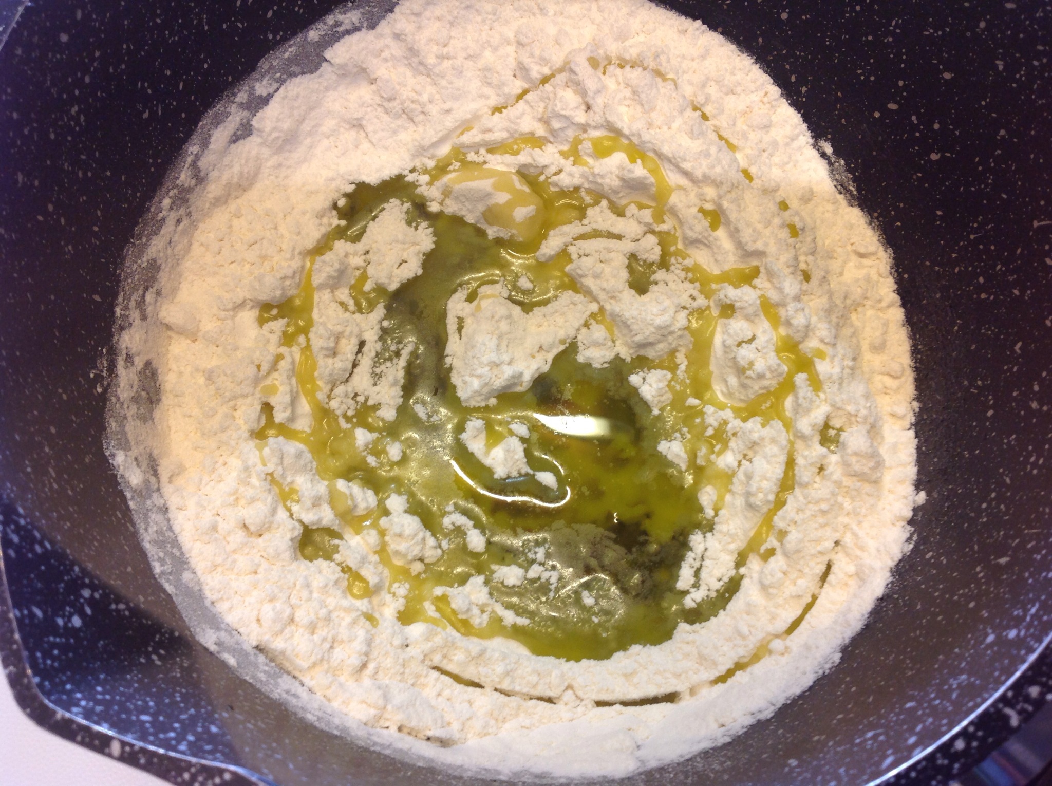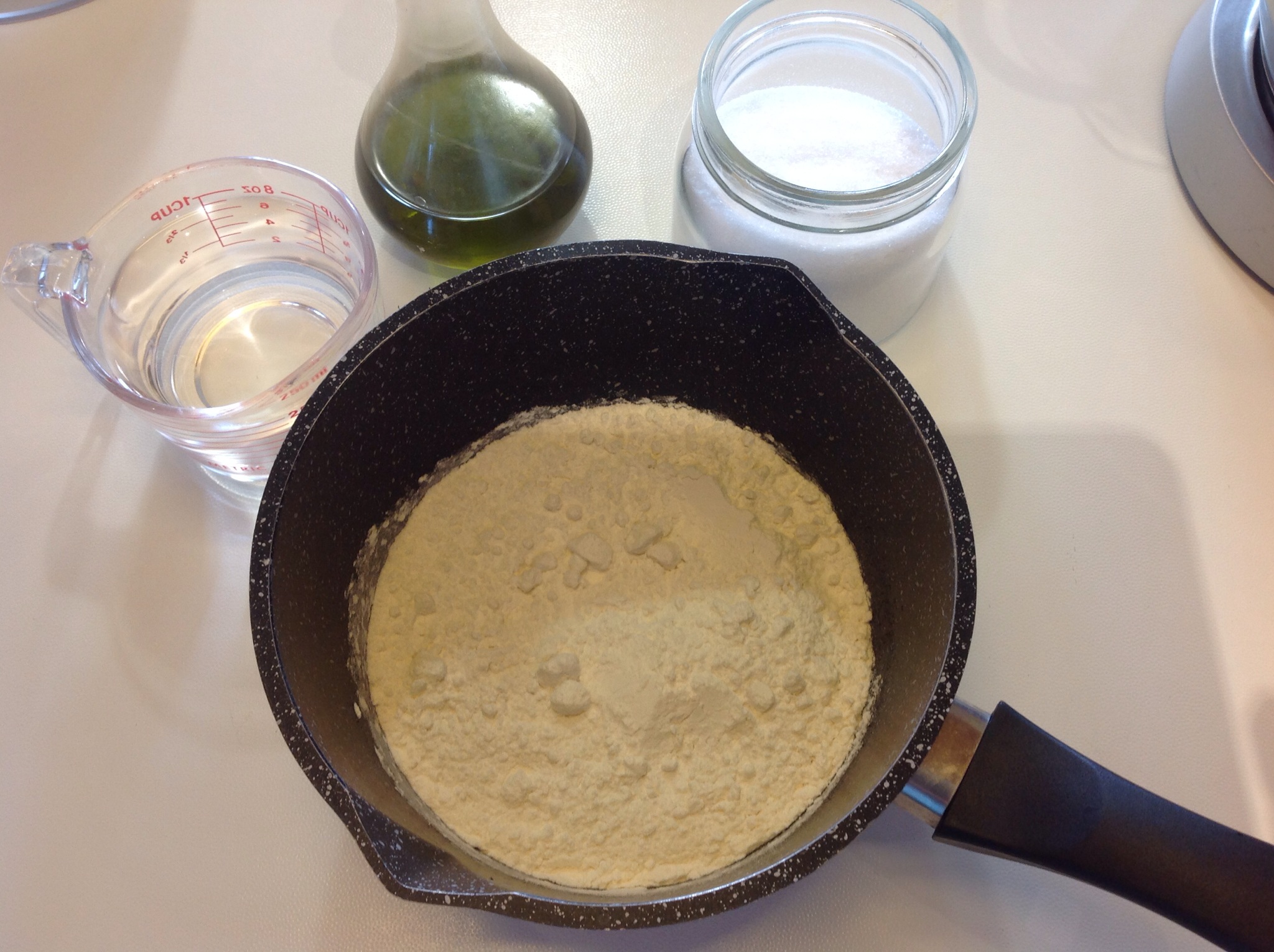 Peso direttamente la farina e l’olio in un pentolino antiaderente