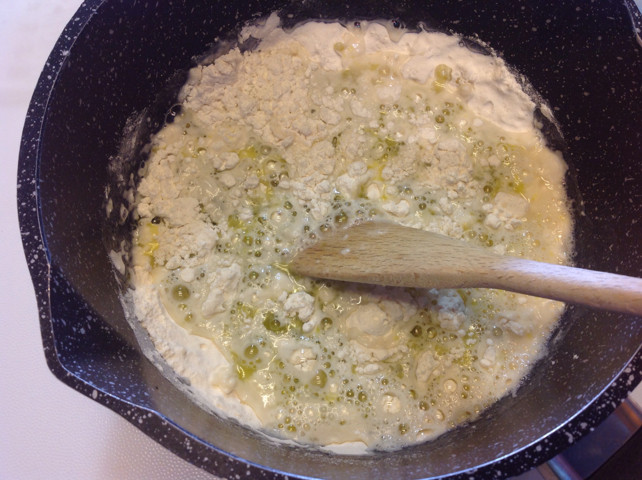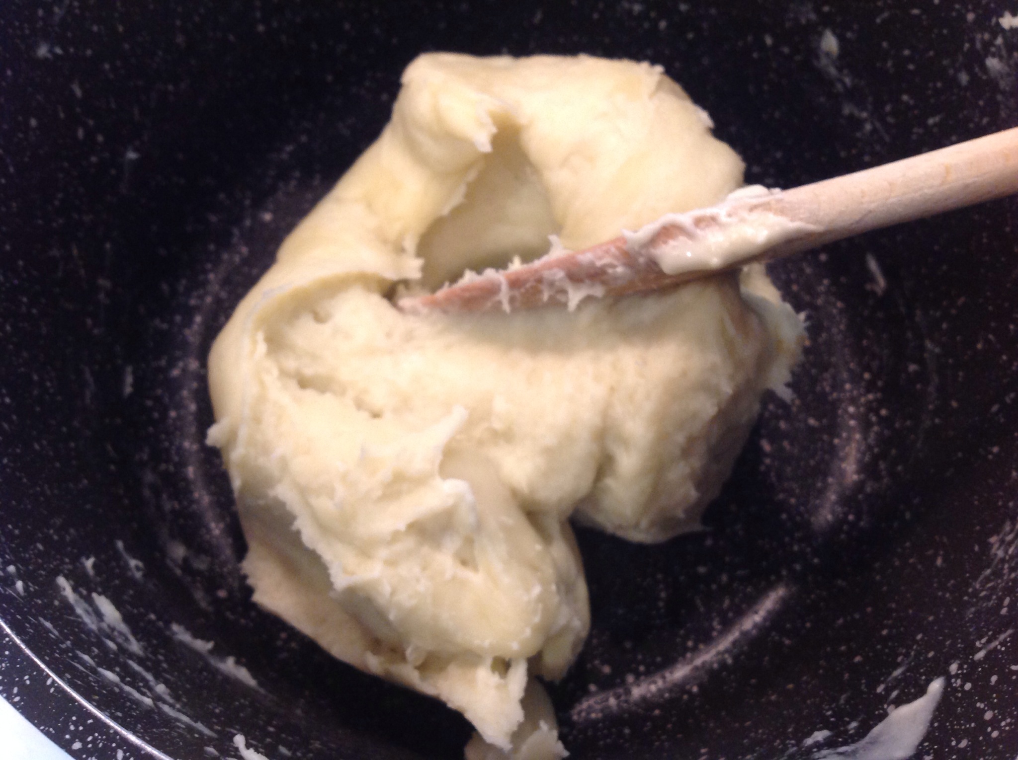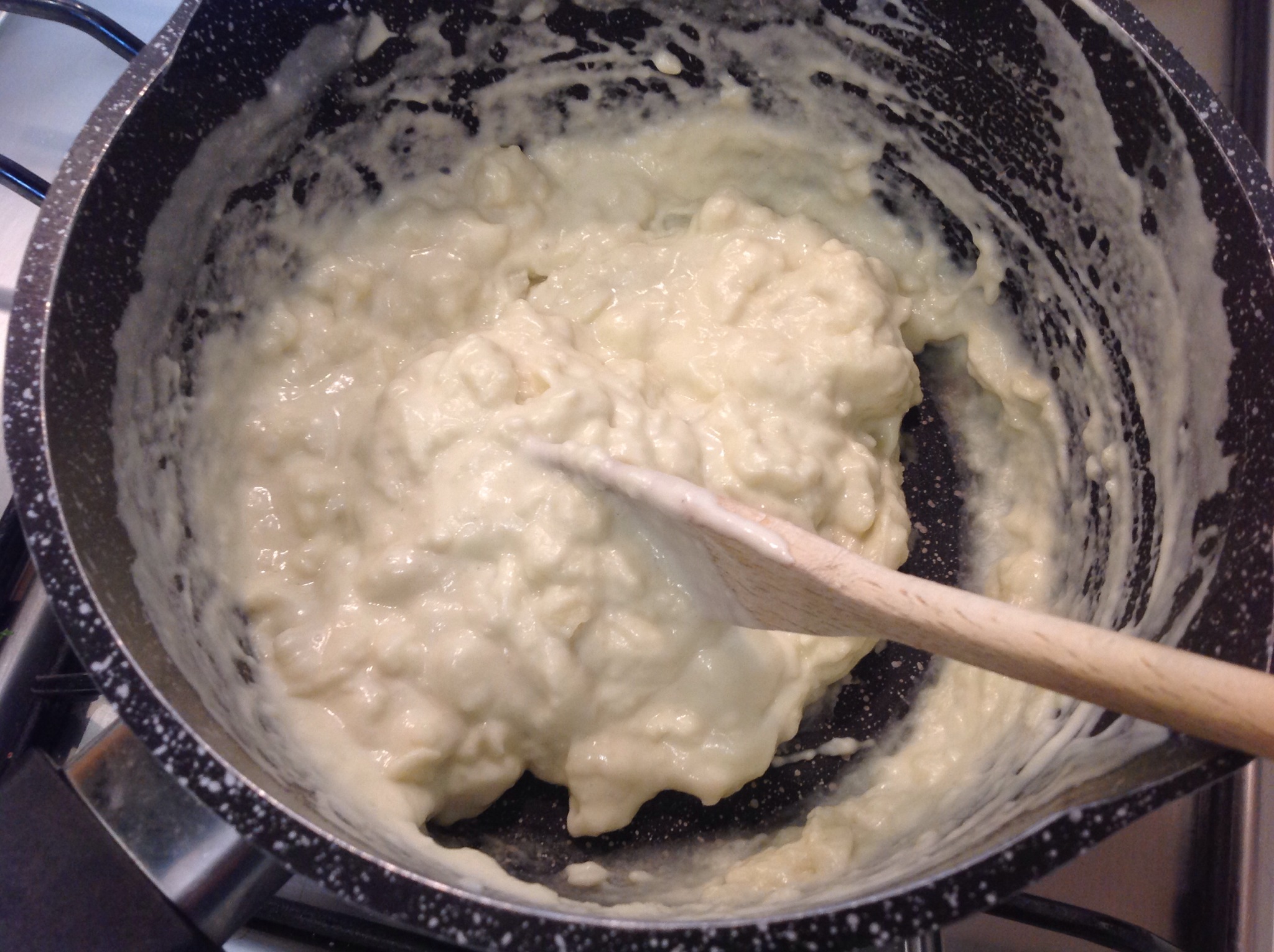 Porto sul gas a fuoco basso e continuo a mescolare finché il composto si stacca dalle pareti e diventa liscio