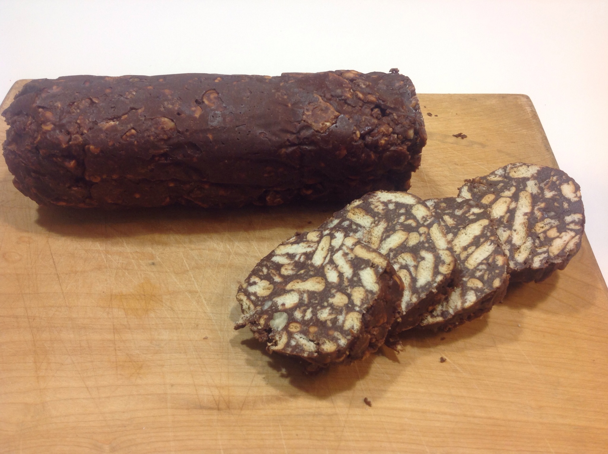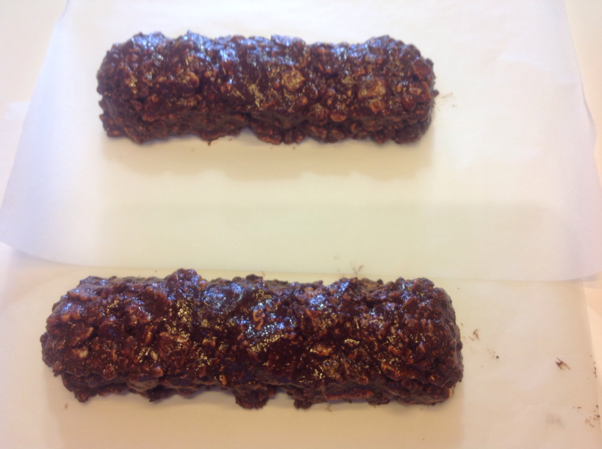 Quando i biscotti sono ben amalgamati al cioccolato, divido il composto in due parti appoggiandolo su due fogli di carta forno dando la forma di due salami