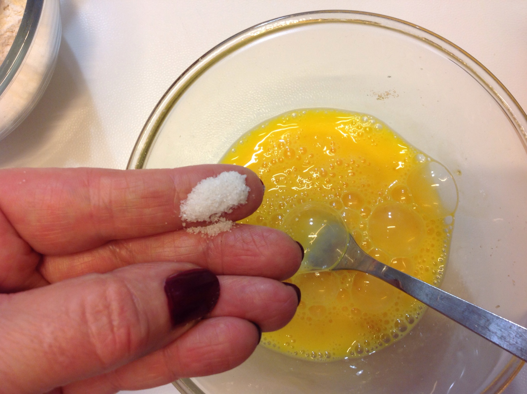 In una ciotola rompo le uova e le amalgamo con una forchetta e aggiungo un pizzico di sale