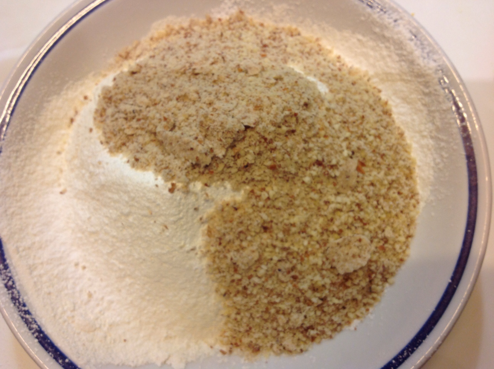 Setaccio la farina, il lievito e aggiungo la farina di mandorle, io ho tritato finemente delle mandorle intere