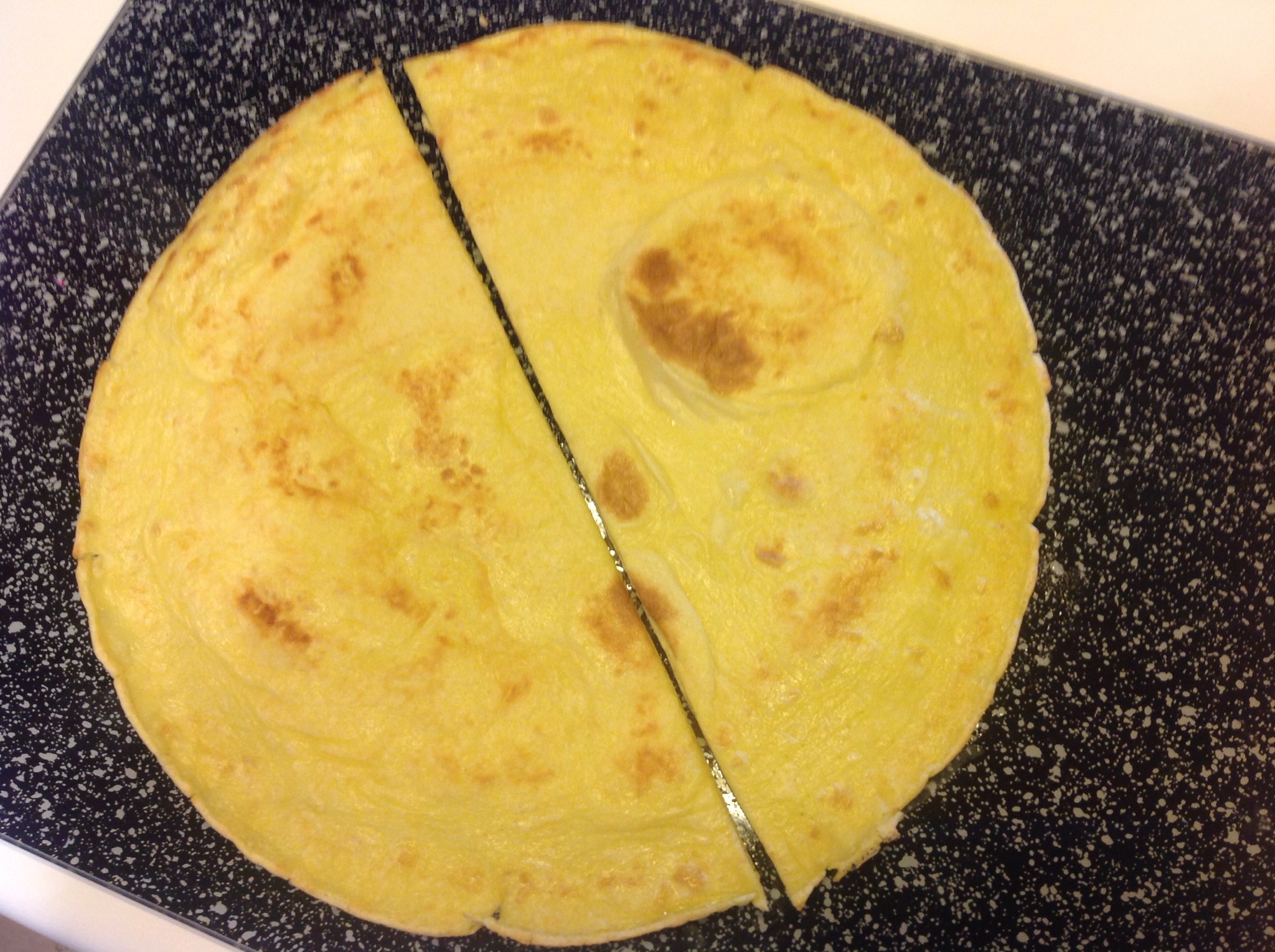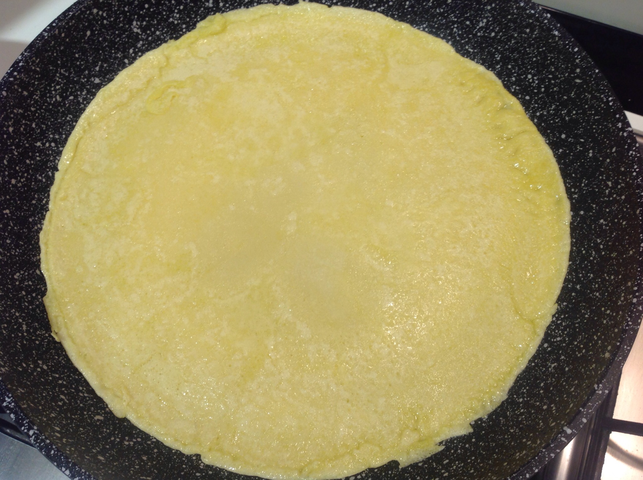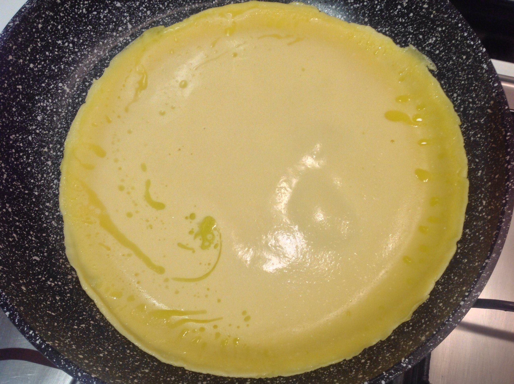 Aggiungo la pastella facendo roteare la padella per distribuire il composto in modo uniforme e la lascio rapprendere